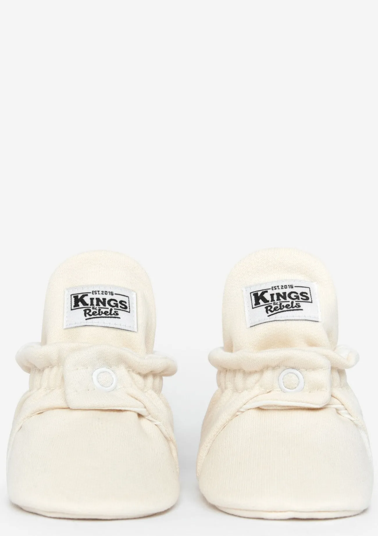 Diese niedlichen Babyschuhe von KINGS & REBELS sind dank des praktischen Druckknopf-Verschlusses ruckzuck über den kleinen, strampelnden Babyfuß gezogen – und rutschen auch nicht wieder ab! Die hautfreundlichen und atmungsaktiven Eigenschaften der umweltfreundlichen Baumwolle erzeugen ein besonders angenehmes Tragegefühl. Da sich die Booties an die individuelle Fußform deines Kindes anpassen, schränken sie die gesunde Entwicklung der Kinderfüße nicht ein und sind superbequem.