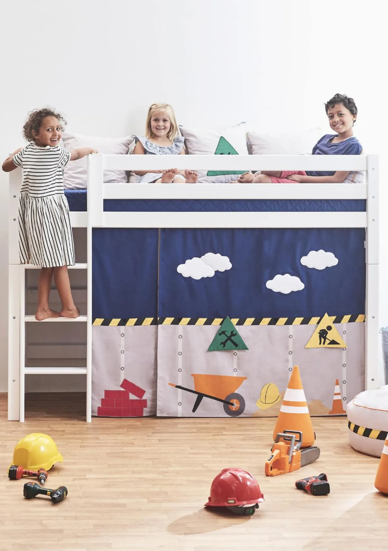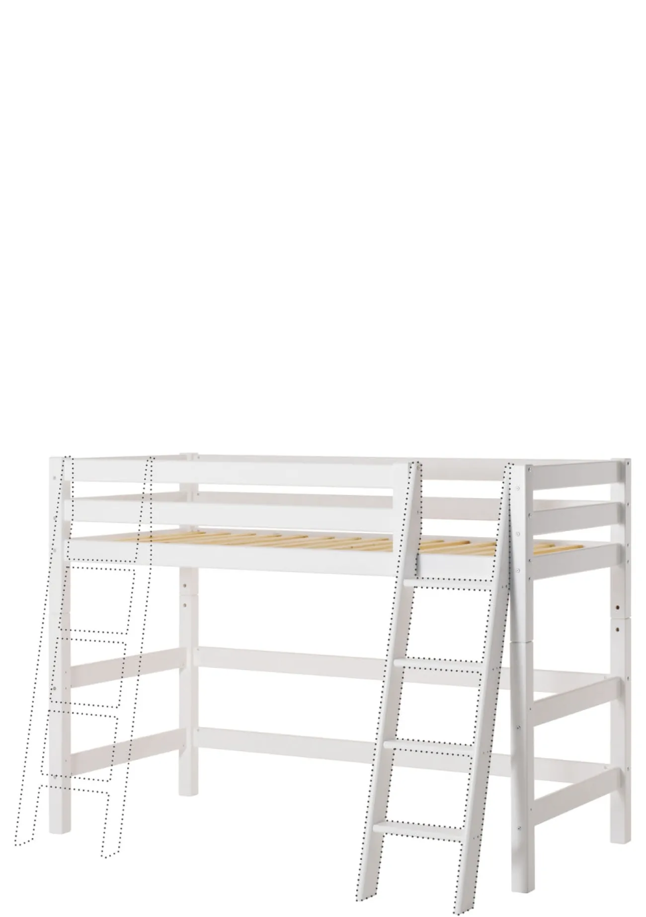 Dieses praktische und clevere Mittelhochbett ist in verschiedenen Größenvarianten erhältlich und kommt nach Belieben mit einer schrägen oder einen geraden Leiter. Als platzsparende Alternative zum herkömmlichen Kinderbett ist das Modell auch für kleine Räume prima geeignet, da es unterm Schlafbereich ausreichend Platz bietet. Diesen könnt ihr nach Bedarf zu Aufbewahrungszwecken oder zum Schaffen eines eigenen kleinen Kinderreichs nutzen.
