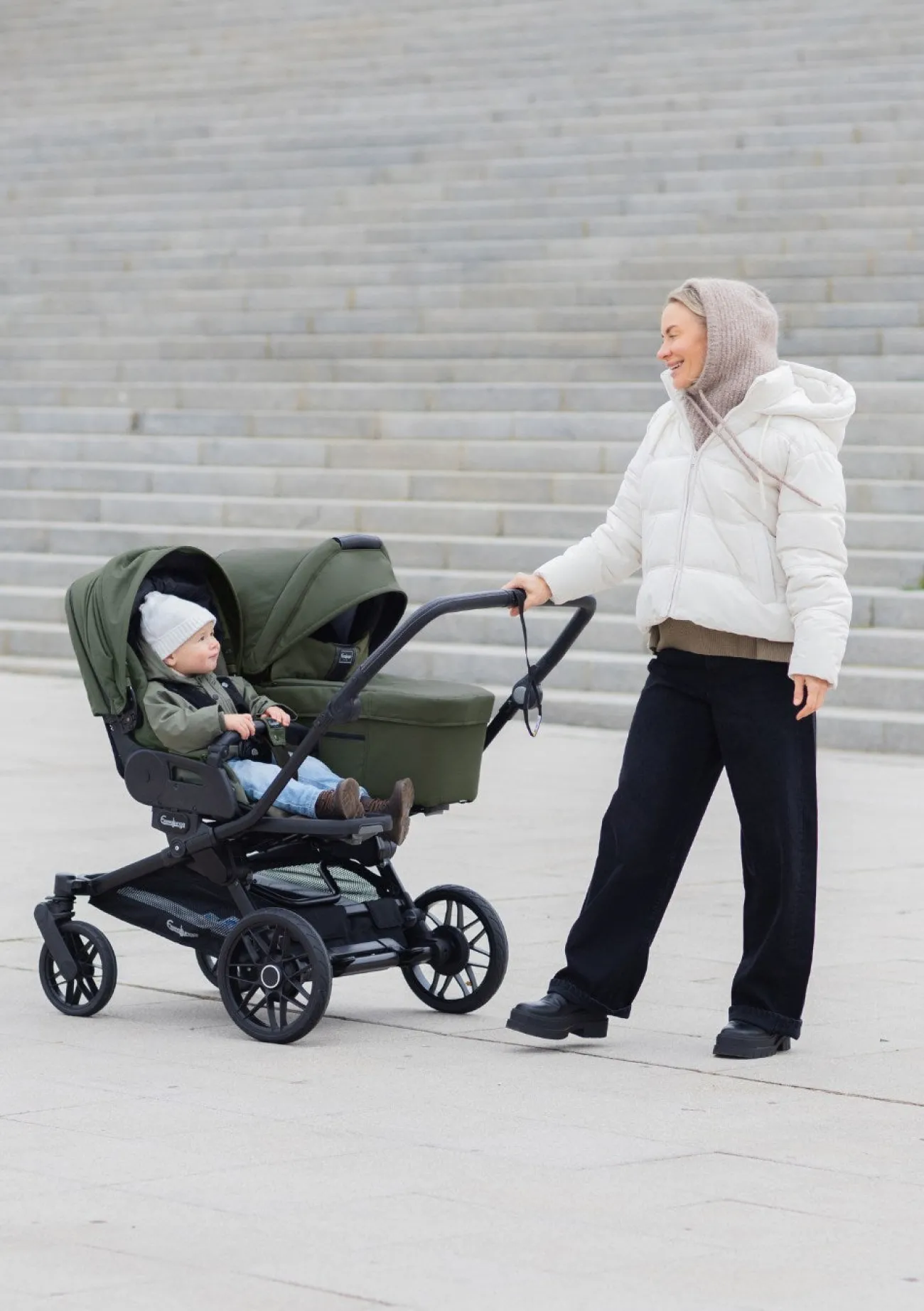 Nachhaltig in Schweden gefertigt, verbindet der Geschwister-Kinderwagen modernes Design mit langlebiger Qualität – perfekt für aktive Familien mit zwei kleinen Abenteurern.