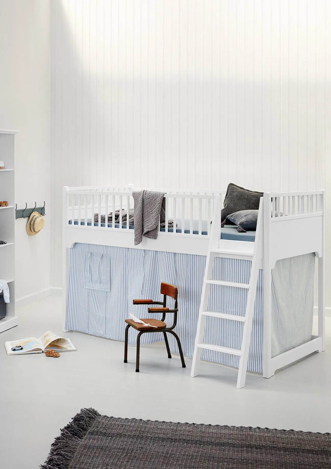 Das halbhohe Hochbett aus der Seaside Collection von OLIVER FURNITURE bietet eine einzigartige Möglichkeit, nicht nur einen schönen Schlafplatz im Kinderzimmer zu gestalten, sondern auch das kindliche Bedürfnis nach Nähe, Komfort und Sicherheit zu erfüllen. Unter dem Bett kann dein Kind ein kleines gemütliches Versteck zum Spielen oder Entspannen bauen, oder einen Freund übernachten lassen.