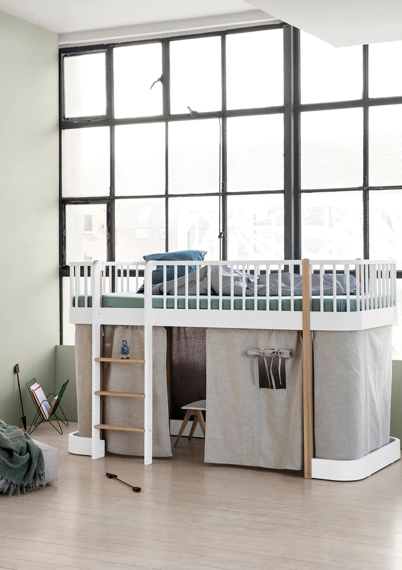 Jedes Kind liebt es, sein eigenes Reich um sich zu haben! Diesen geheimen Rückzugsort schenkst du deinem Kind, mit einem Vorhang für sein Mini+ Etagenbett von OLIVER FURNITURE. Die eingenähte Türe ist der Eingang in die Räuberhöhle und die integrierten Fenster sind perfekt, um die Umgebung zu beobachten!