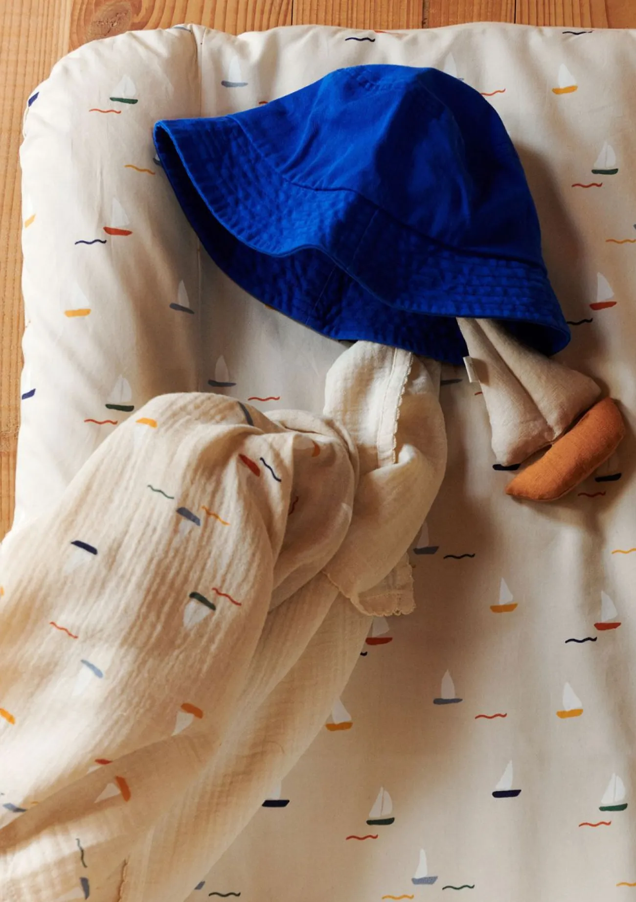 Diese Wickelauflage von DEAR APRIL zeigt sich mit Segelboot-Prints, die einen maritimen Look erzeugen. Ein kleines Boot, das vom Wind getragen übers Wasser gleitet – der Pond Boats-Druck fängt diese zeitlose Magie und kindliche Abenteuerlust wunderbar ein.
