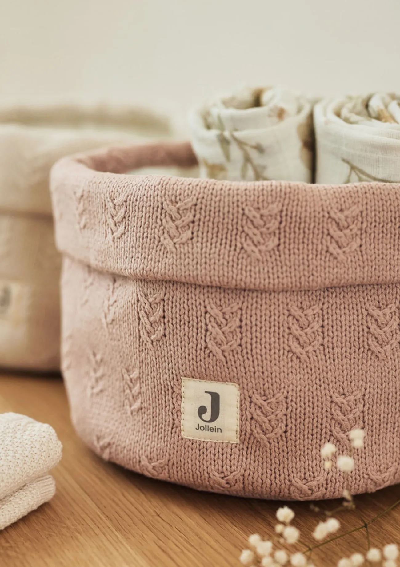 In diesem bezaubernden Körbchen von JOLLEIN habt ihr alle Wickelutensilien stets zur Hand. Die äußere Strickoptik verleiht dem Korb eine charmante Note, während das Innere mit Polyester ausgekleidet ist, um schmierige Öle, Cremes und Feuchttücher ordentlich zu verstauen – ohne Rückstände auf euren Möbeln zu hinterlassen.
