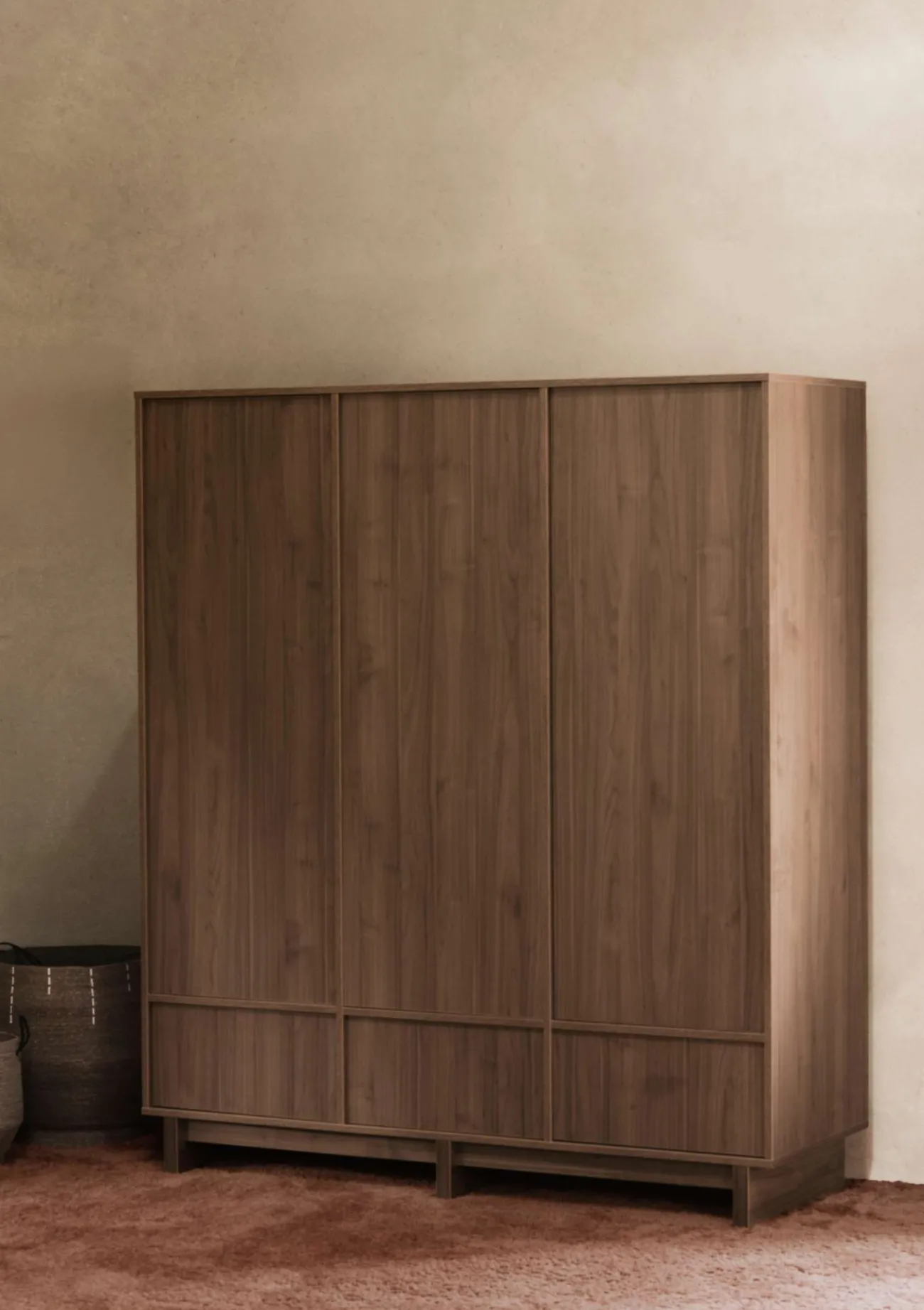Dieser extra große Kleiderschrank mit drei Türen vereint ästhetisches Design mit durchdachter Funktionalität. Inspiriert von skandinavischer Schlichtheit und japanischer Ruhe bringt er Ordnung und Harmonie in dein Zuhause – mit klaren Linien, warmen Holznuancen und einer beruhigenden, aufgeräumten Optik.