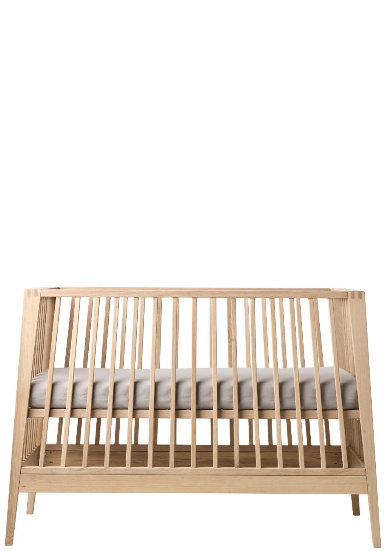 Die hochwertige Verarbeitung aus massivem Eichenholz macht das Babybett nicht nur zu einem stabilen und langlebigen Begleiter, sondern auch zu einem ästhetischen Möbelstück. Die markante Linienführung und die leicht ausgestellten Beine sorgen für eine elegante, zeitlose Anmutung, die den natürlichen Charakter des Holzes perfekt unterstreicht.