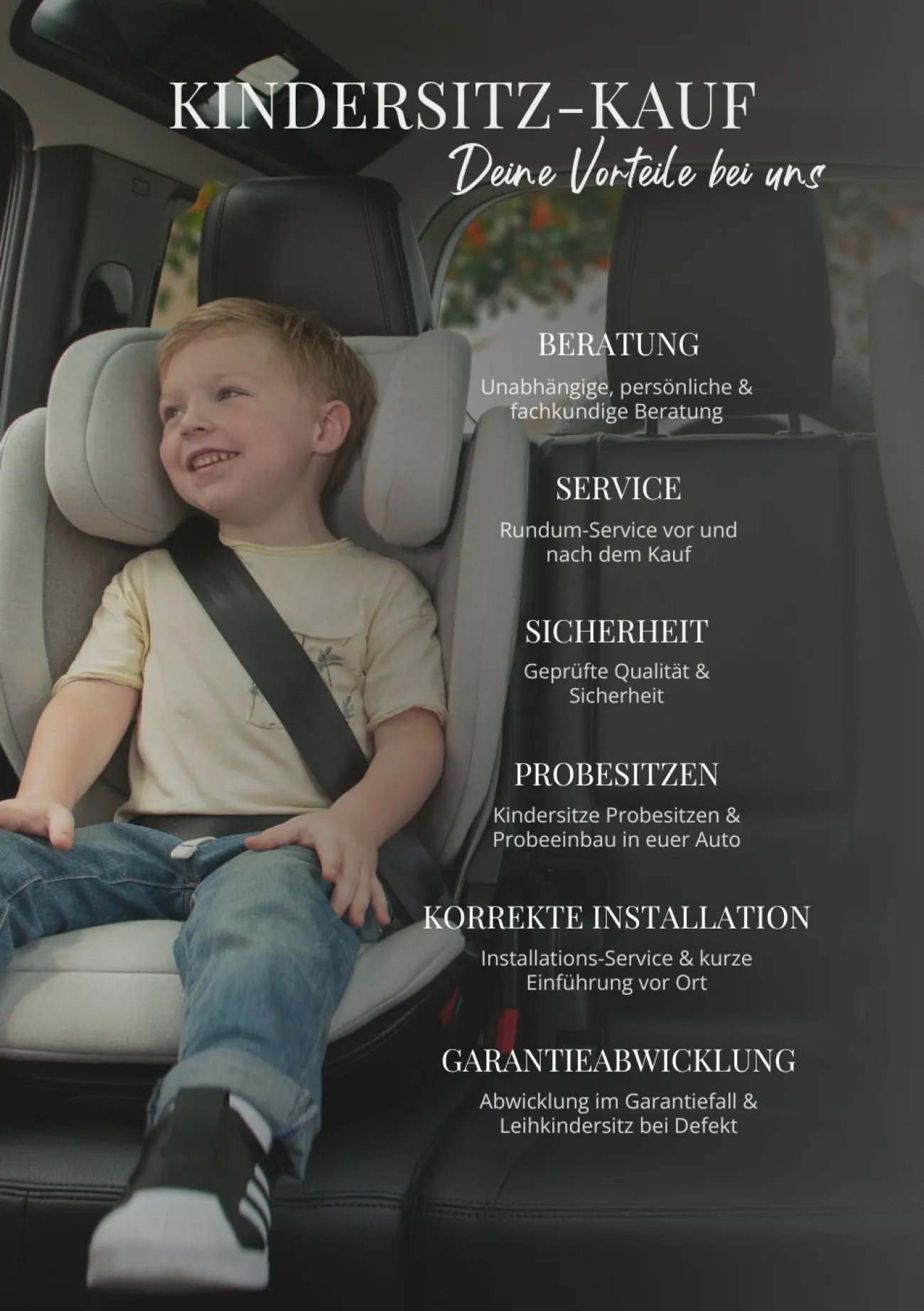 Seit Einführung der i‑Size-Norm sind unsere Kindersitze in der Regel mit den meisten modernen Fahrzeugen kompatibel. Wenn ihr ein besonders großes Fahrzeug, einen Van oder Bus fahrt oder ein Auto ohne i‑Size‑gekennzeichnete Sitzplätze nutzt, empfiehlt es sich, vorab per E‑Mail, telefonisch oder direkt vor Ort Rücksprache mit einem unserer Fachgeschäfte zu halten. Ein gemeinsamer Testeinbau in euer Fahrzeug ist jederzeit möglich, um die Kompatibilität zu prüfen und maximale Sicherheit zu gewährleisten.