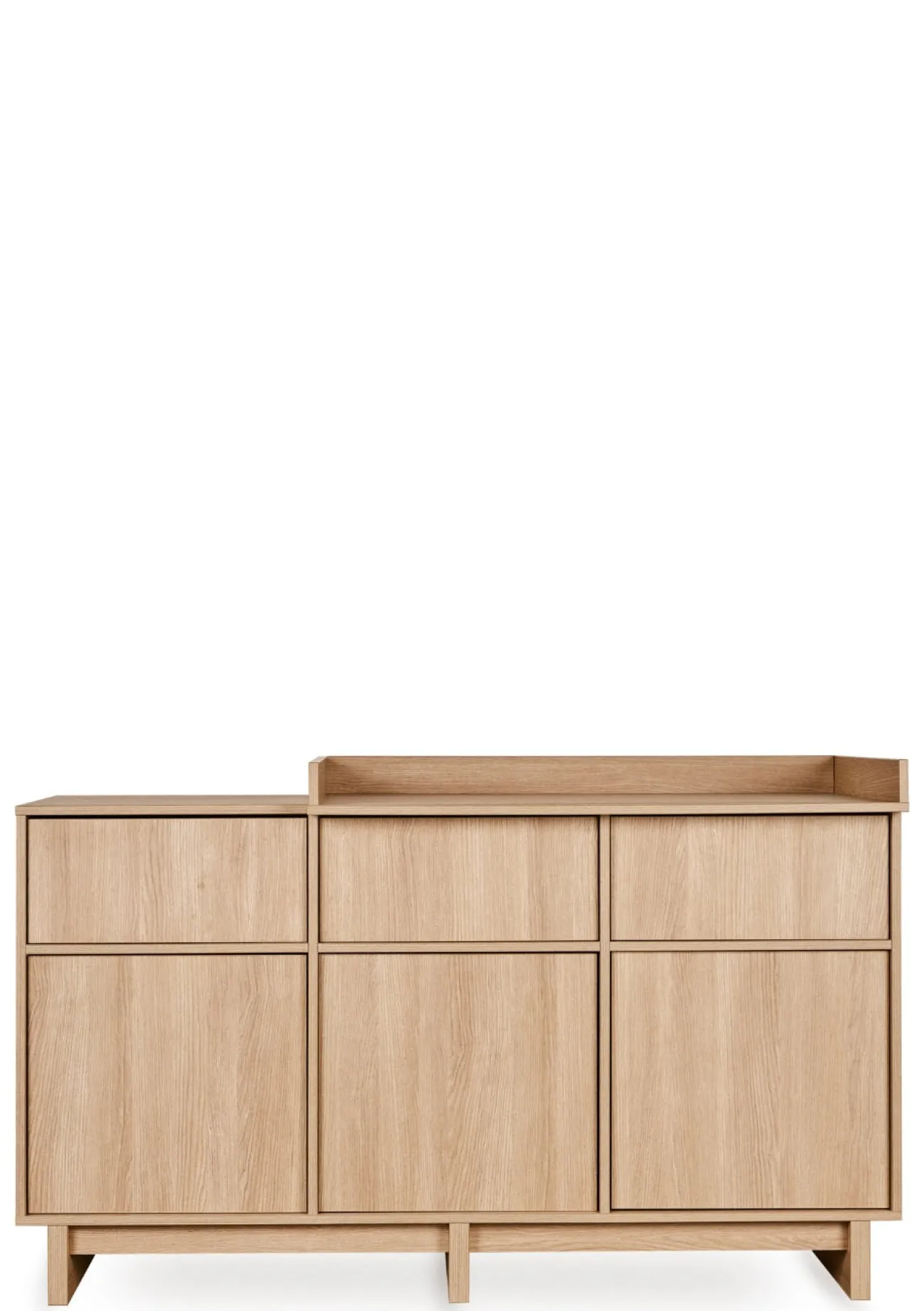 Mit ihrem extra breiten Format bietet die Kommode besonders viel Stauraum für Kleidung, Pflegeprodukte oder Alltagsutensilien. Hinter den drei Türen und in drei geräumigen Schubladen lassen sich alle Dinge des täglichen Lebens übersichtlich verstauen. In Kombination mit dem optional erhältlichen Wickelaufsatz wird sie zur praktischen Wickelkommode XL – perfekt für die ersten Jahre mit deinem Baby. Nach der Wickelzeit lässt sich der Aufsatz rückstandslos entfernen, sodass die Kommode als stilvolles Möbelstück im Kinder- oder Familienzimmer weiterbesteht. Ein hochwertiges Möbelstück, das mit der Familie mitwächst und viele Jahre Freude bereitet.