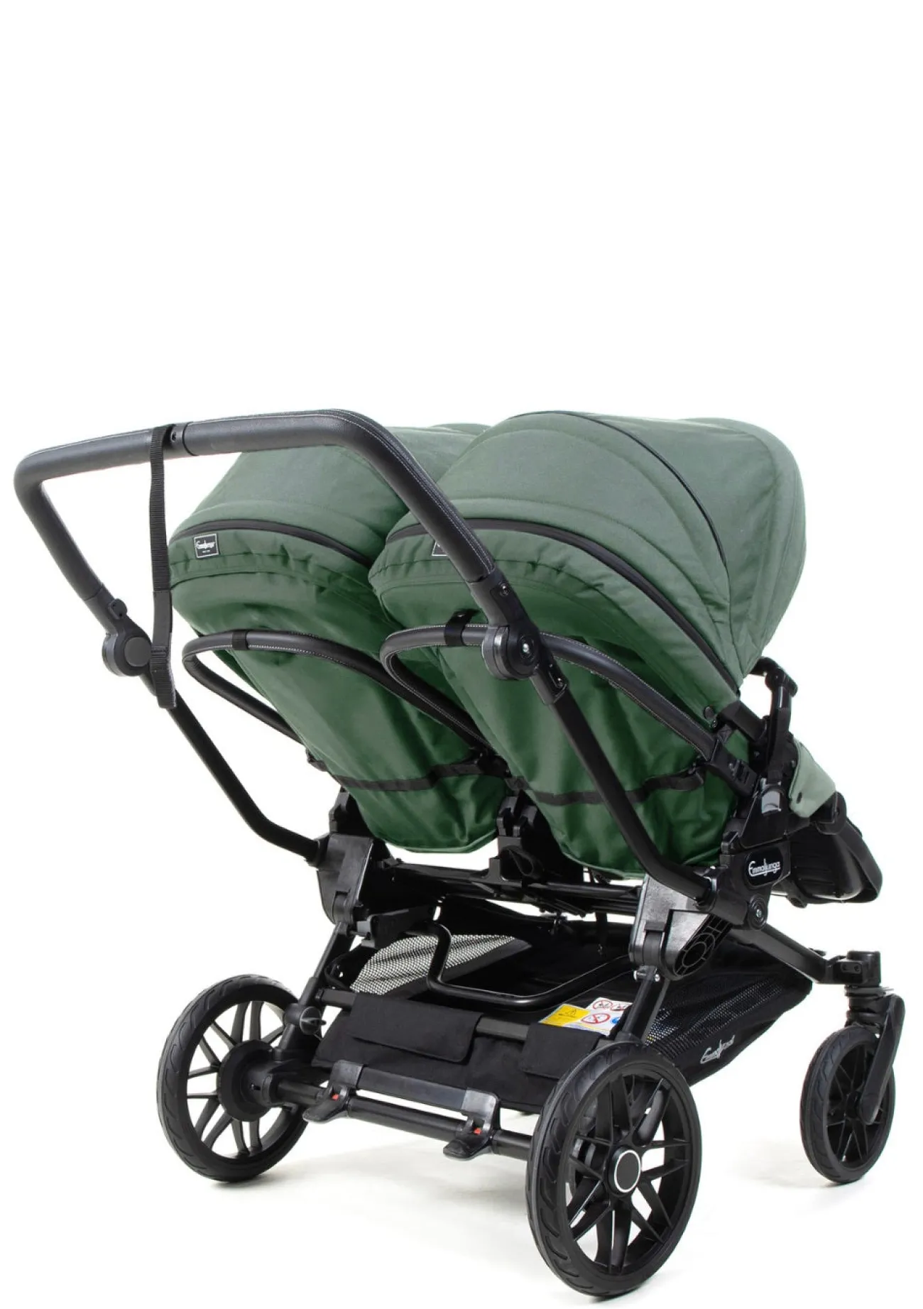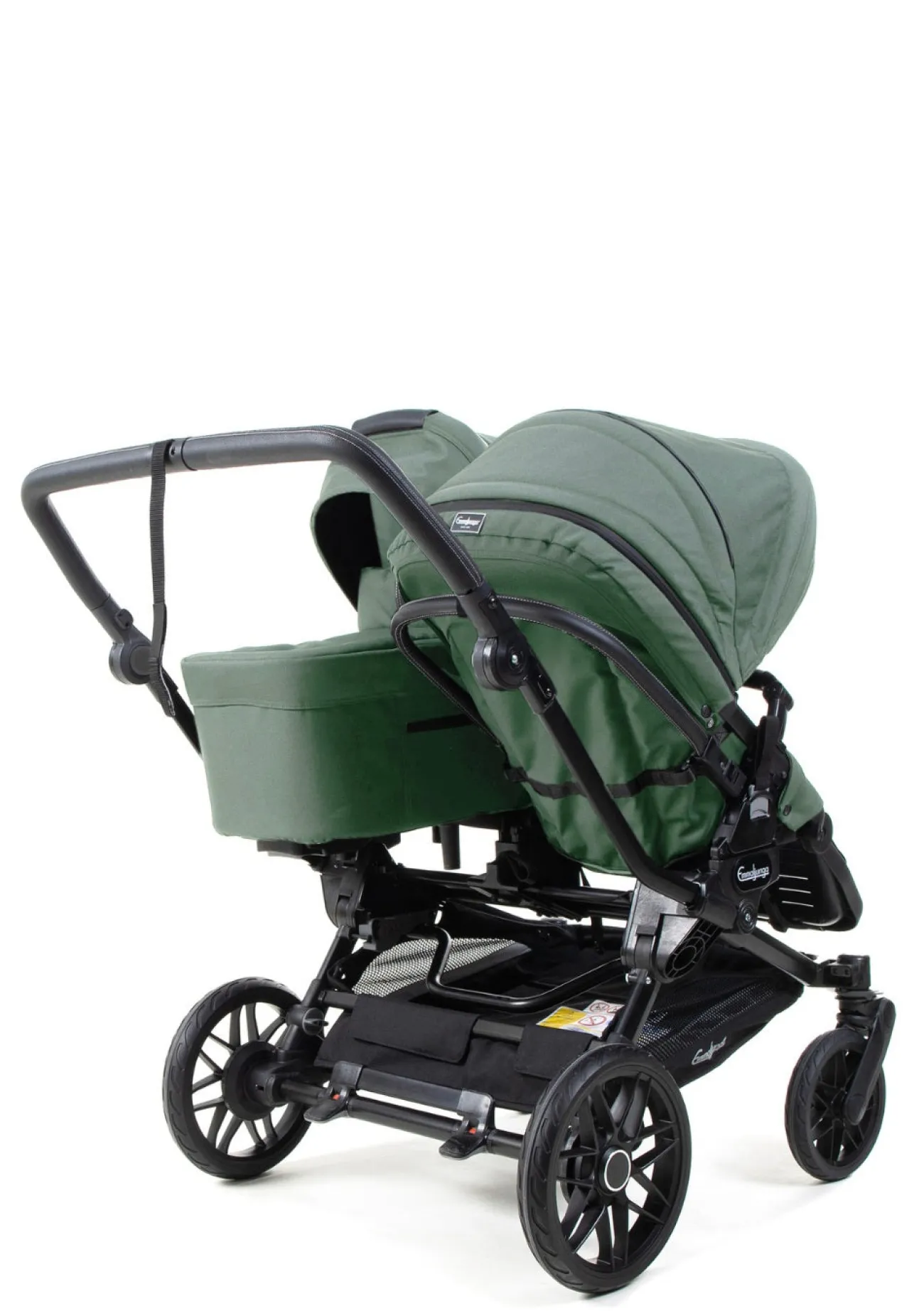 Die fantastische Vierradfederung mit einstellbarer Hinterradfederung garantiert eine komfortable, ruhige Fahrt mit zwei Kindern. Unebenheiten werden zuverlässig abgefedert, sodass beide entspannt unterwegs sind. Das Gestell lässt sich einfach zusammenklappen und superkompakt verstauen. Der klappbare Griff erleichtert zudem das Reisen mit Bus und Bahn.