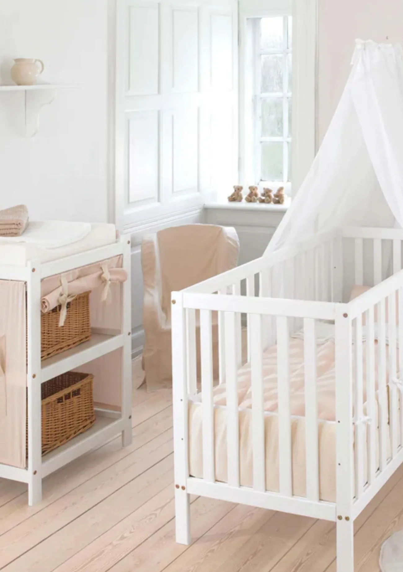 Bitte beachte, dass eine Wickelauflage und die textilen Seitenteilen für den Wickeltisch sowie ein Betthimmel fürs Babybett separat erhältlich sind.