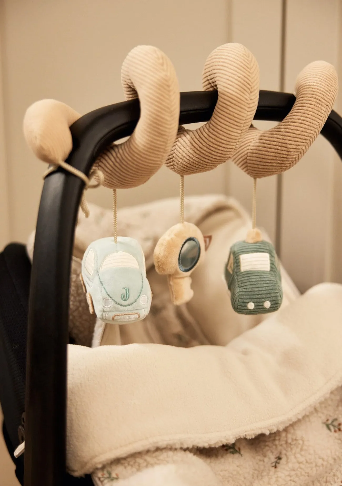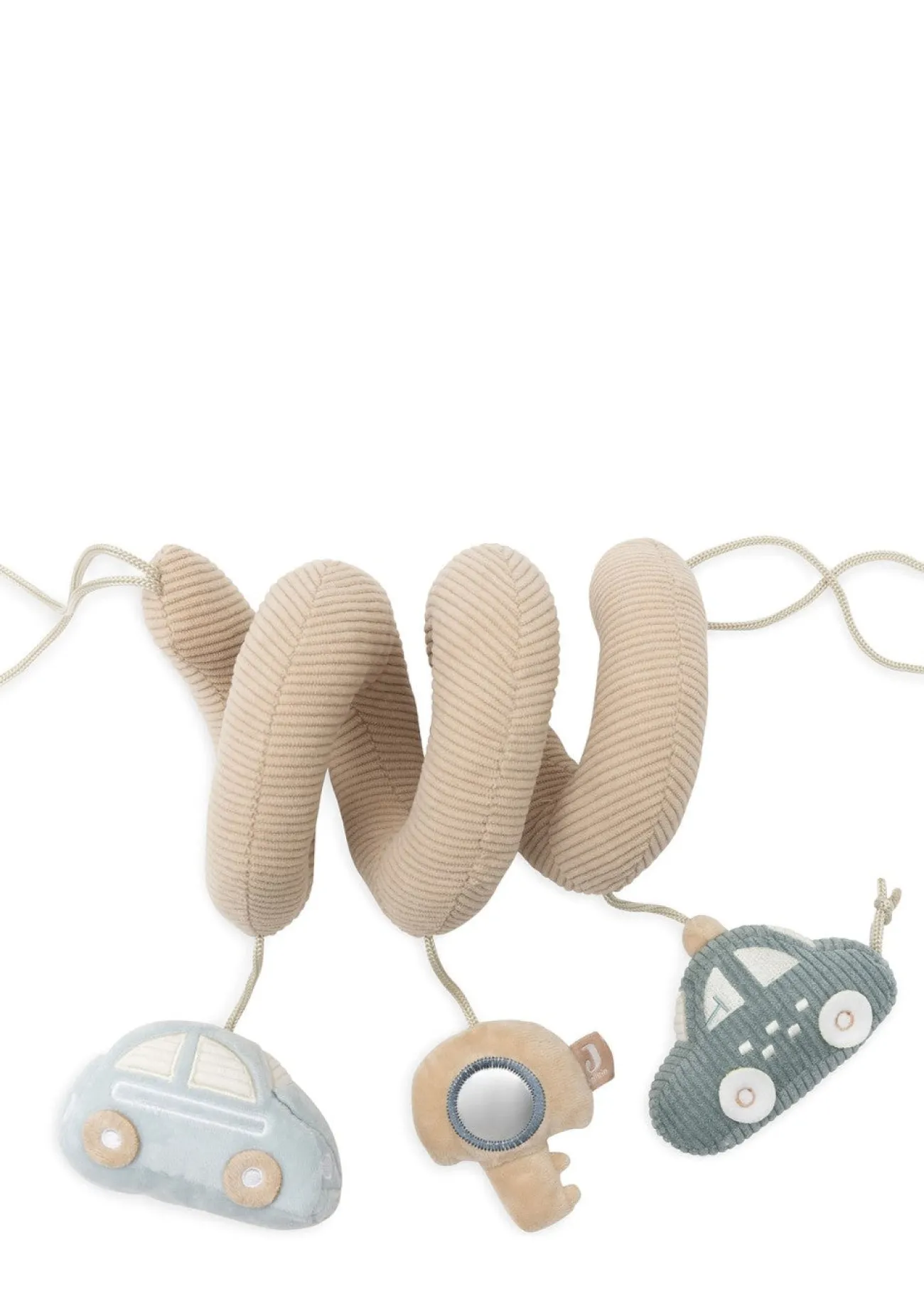 Diese vielseitige Aktivitätsspirale von JOLLEIN sorgt überall für gute Laune und abwechslungsreiche Spiele! Zwei fröhliche Autos, ein praktischer Schlüssel laden zum Greifen und Tasten ein. Der integrierte Spiegel, ein Glöckchen und ein spannendes Knisterelement fördern spielerisch die Sinne deines Babys. Dank der praktischen Befestigungsschlaufen an beiden Enden lässt sich die Spirale ganz einfach am Laufgitter, Babybett oder an der Babyschale fürs Auto befestigen.