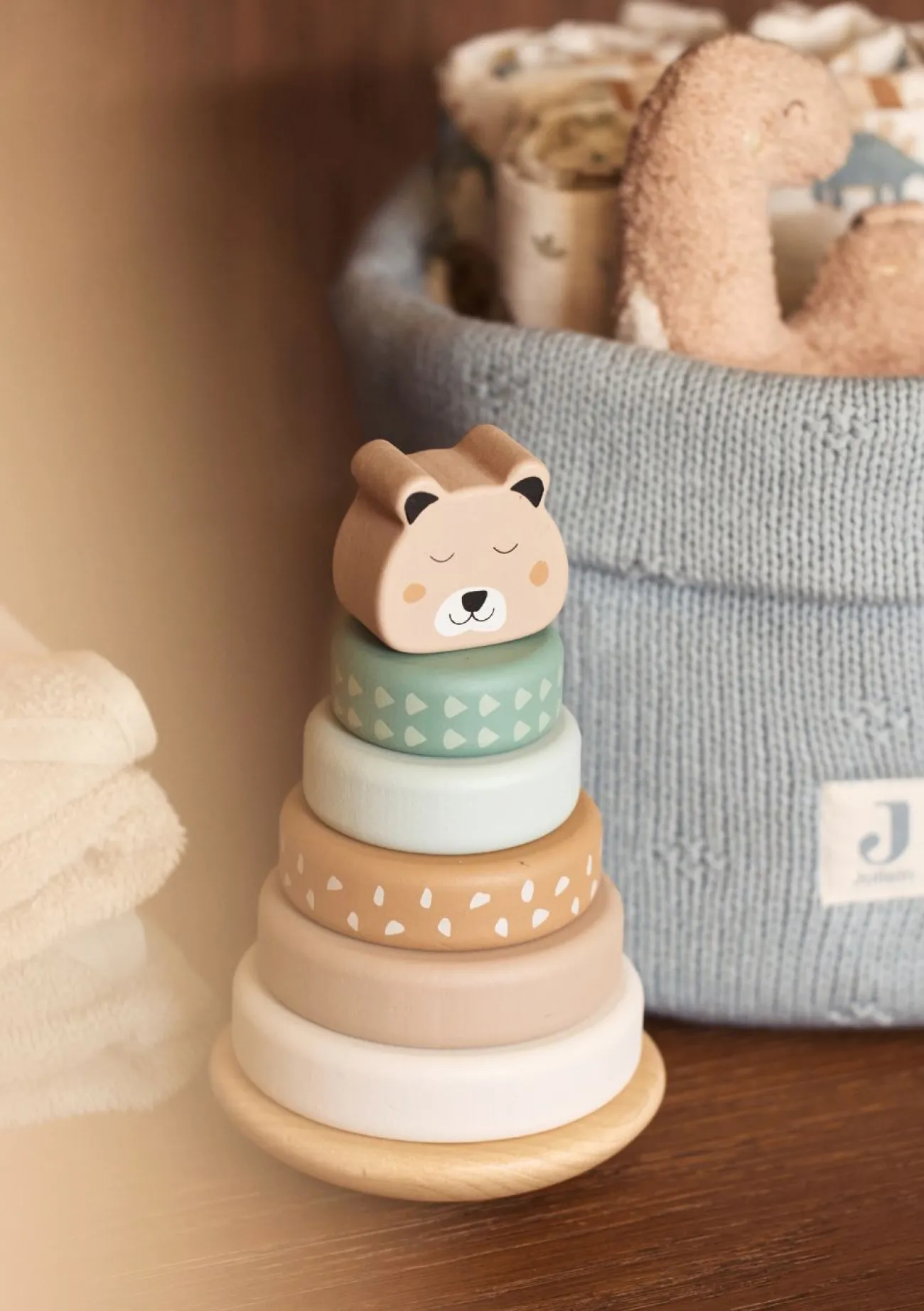 JOLLEIN präsentiert diesen Klassiker in der Jungle Jambo-Kollektion in besonders süßer Aufmachung. Durch das Greifen, Sortieren und Stapeln der fünf verschieden großen Ringe werden die Feinmotorik und die Hand-Auge-Koordination deines Kindes trainiert. Und wenn das Spielzeug mal nicht im Einsatz, macht es dank des stilvollen Designs eine gute Figur im Spielzeugregal.