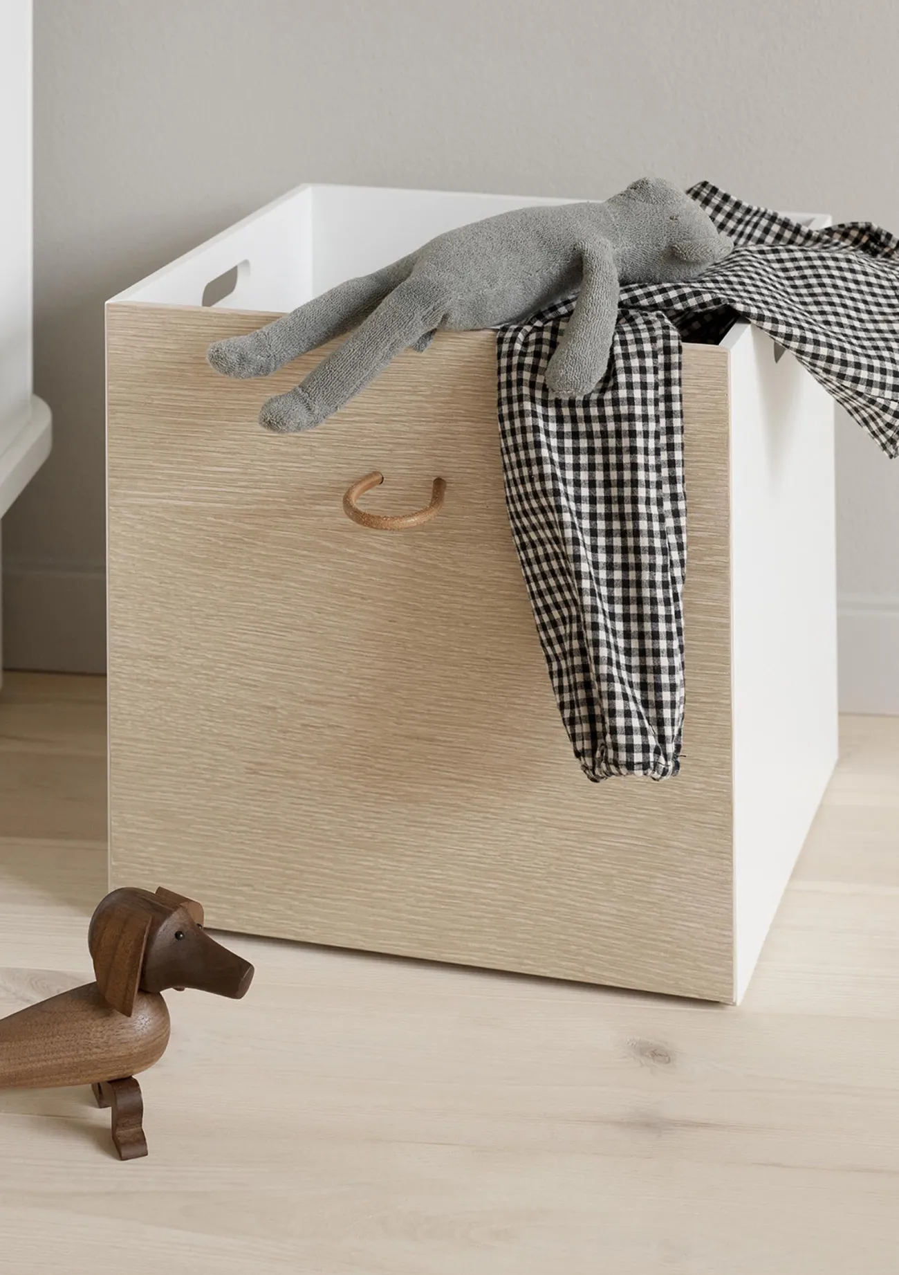 Die hochwertigen ‚Wood‘ Aufbewahrungskisten sind zuverlässige Ordnungshelfer im Kinderzimmer. Hier verschwinden Spielzeug und Kuscheltiere in Sekunden! Mit drei weißen Seiten und einer Seite aus Eichenholz passen sie zu allen OLIVER FURNITURE Regalen, machen aber auch alleine eine gute Figur.