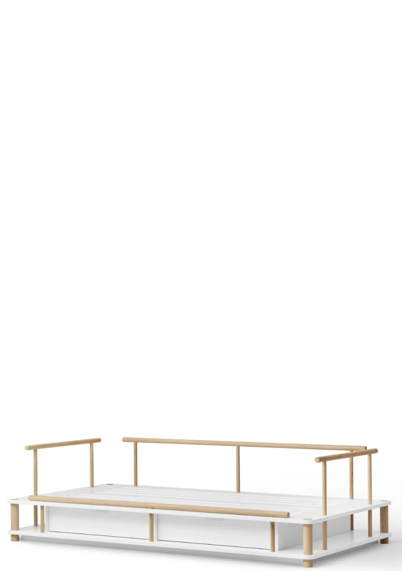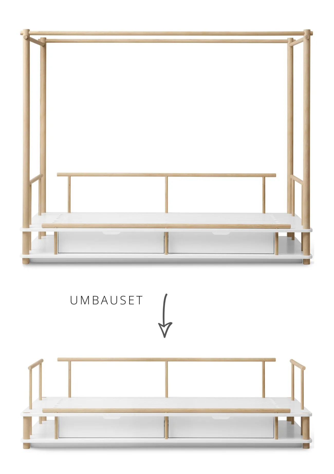 Die typischen Linien des Himmelbetts bleiben dabei erhalten. Das Bettsofa überzeugt mit seinem niedrigen Rahmen aus elegant geformten Eichenrundstäben an den Seiten und der Rückenlehne, dezent verdeckten Schrauben und kann bei Bedarf mit separat erhältlichen Schubladen für stilvollen Stauraum ausgestattet werden. Mit Kissen, Decken oder Plaids lässt es sich im Handumdrehen in eine gemütliche Sofalandschaft verwandeln. Ein vielseitiges Möbelstück, das Funktionalität und Design vereint – und das Kinderzimmer um ein charmantes Highlight bereichert.