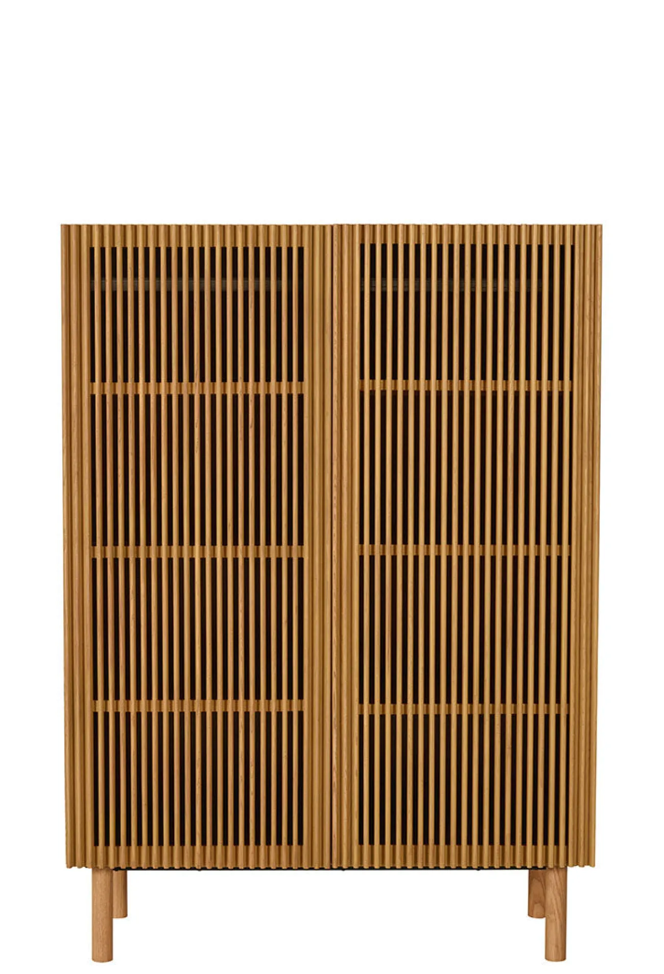 - Material: MDF-furniertes Eschenholz, Türen mit transparenten Streben aus massivem Eschenholz