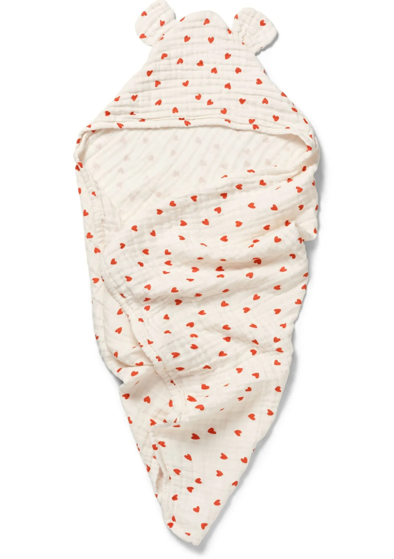 Dieses superweiche Kapuzenhandtuch für Babys und Kleinkinder begeistert in liebevollem Herzchen-Dessin und macht jede Badezeit zu einem wohlig-warmen Vergnügen. Gefertigt aus 4-lagigem Bio-Musselin, ist es besonders sanft zur empfindlichen Kinderhaut und schmiegt sich wunderbar weich an. Die niedlichen kleinen Öhrchen sind ein schönes Details und unterstützen den verspielten Look.