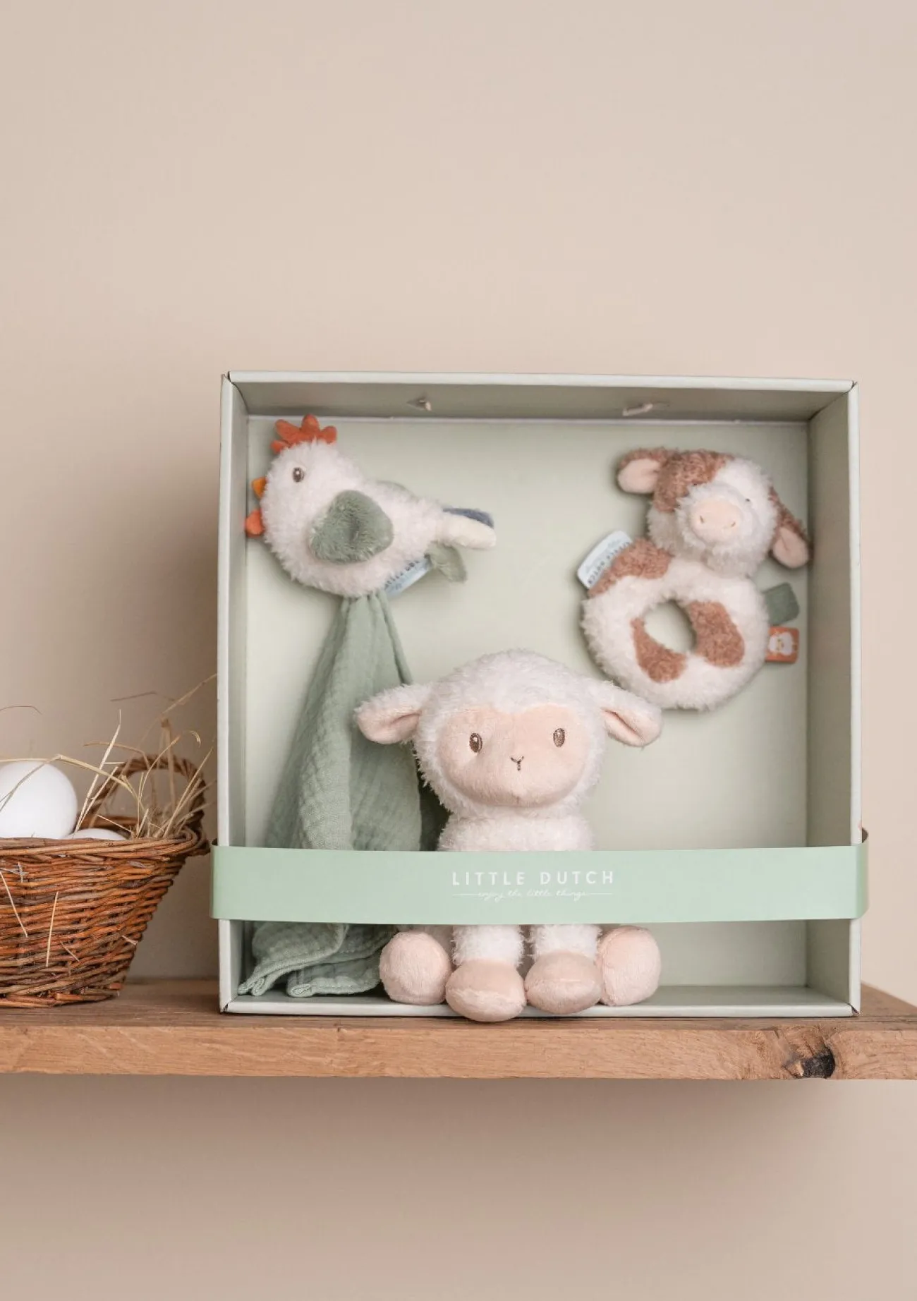 Hübsch verpackt kommen diese drei niedlichen Spielzeuge aus der Little Farm-Kollektion von LITTLE DUTCH und sind genau das Richtige für den neuen Erdenbürger. Das Set zeichnet sich durch das hübsche Bauernhof-Design aus und besteht aus einem Plüschtier Schaf, einer ringförmigen Kuh-Rassel und einem Schnuffeltuch mit Huhn. Die Spielzeuge sind aus flauschigem Material gefertigt, liegen weich in der zarten Kinderhand und laden zum Spielen und Schmusen ein. Viel Freude beim Verschenken!
