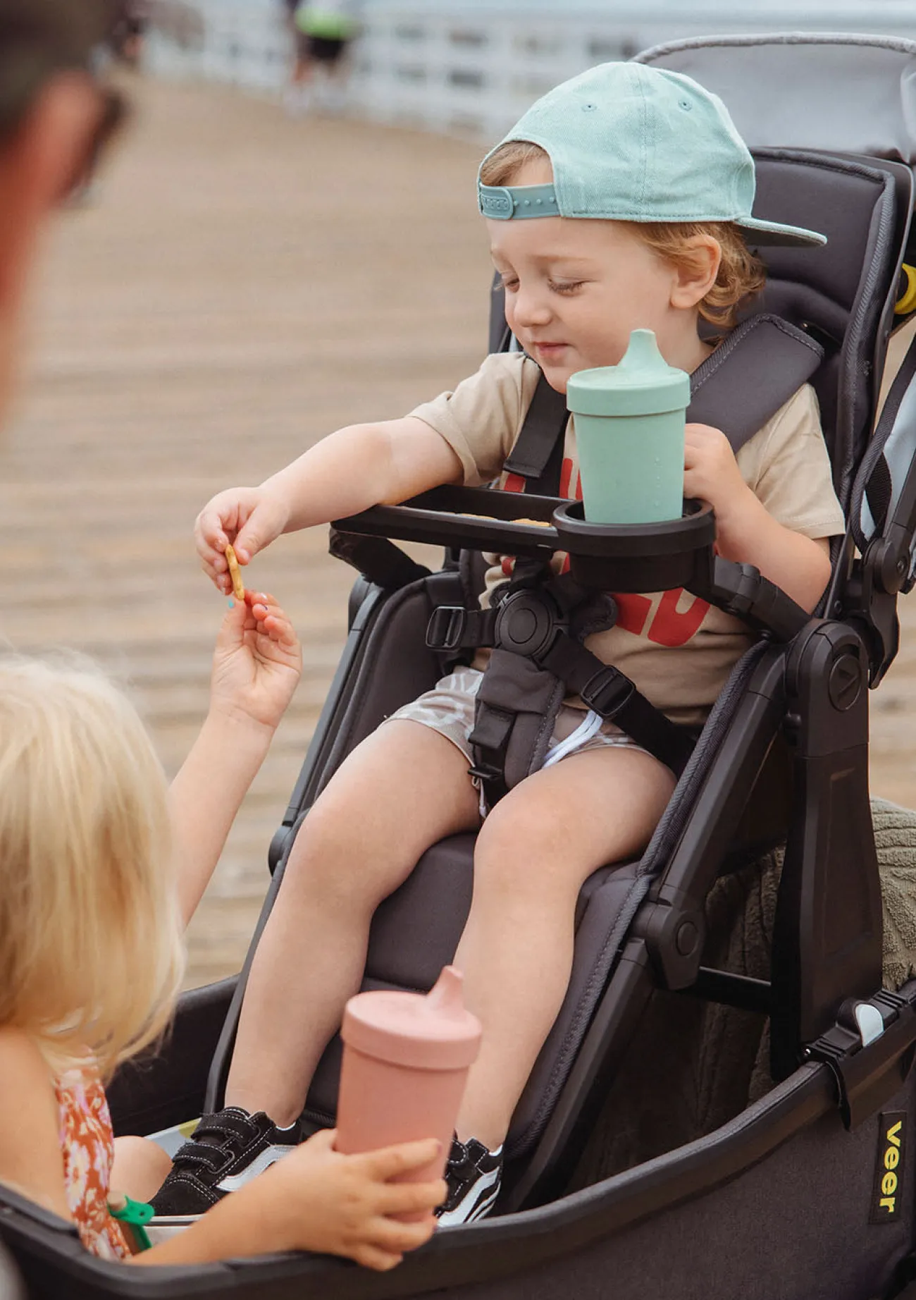 Es lassen sich bis zu zwei Switchback Sitze mit jeweils einem Adapter-Set am VEER Cruiser Gestell befestigen. Die Montage der Adapter ist einfach und sicher.