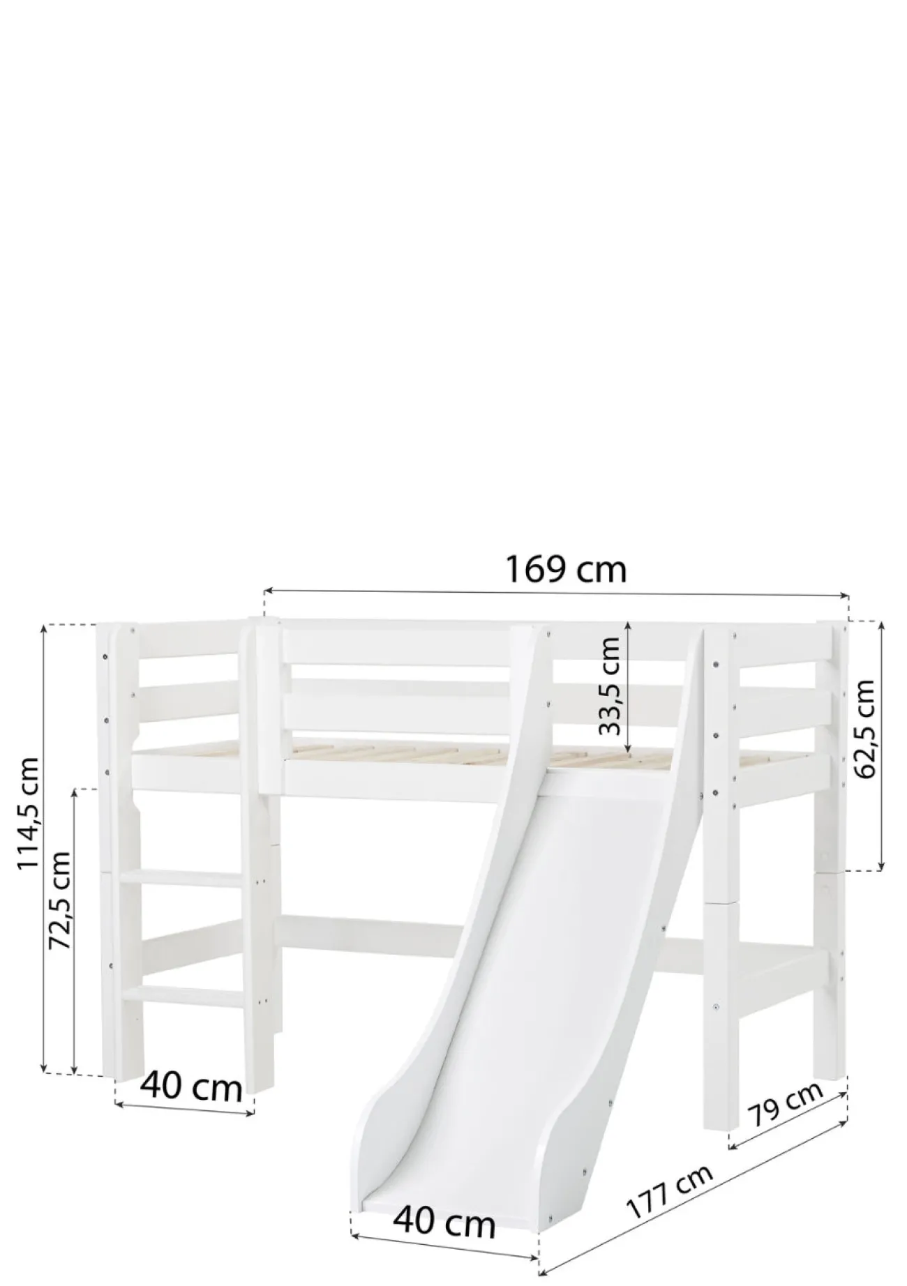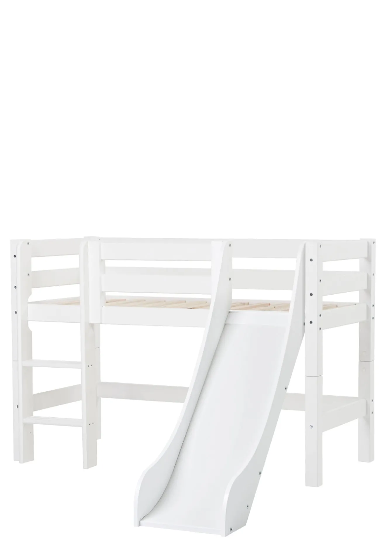 Ausruhen oder spielen? Dieses wunderschöne Halbhochbett macht beides möglich! Tagsüber sorgt die Rutsche, mit der auch das Aufstehen am Morgen viel mehr Freude macht, für aufregenden Spielspaß im Kinderzimmer und abends lädt das gemütliche Bett zum Hineinkuscheln und Träumen ein! Es ist in verschiedenen Größenvarianten erhältlich und kommt nach Belieben mit einer schrägen oder einen geraden Leiter. Die Höhe des Bettes ist prima für kleinere Kinder geeignet. Denn es nicht so hoch, dass sich diese unsicher fühlen könnten. Den Platz unter dem Bett kannst dafür nutzen, deinem Liebling eine gemütliche Kuschelhöhle zum Verstecken, Spielen oder Vorlesen zu schaffen, oder zu Aufbewahrungszwecken verwenden.