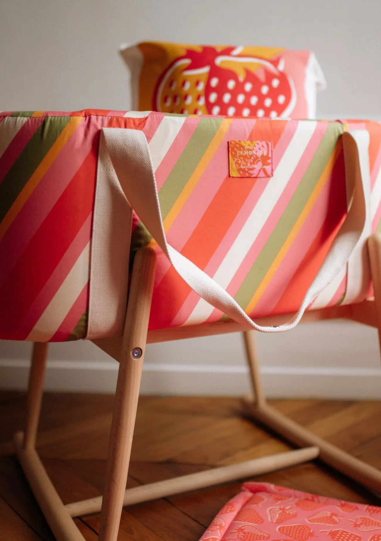 Dieser ästhetische Babykorb KUKO verbindet Komfort und farbenfrohes, grafisches Streifen-Design und ist ein echter Blickfang! Das praktische Körbchen, das sich als Tragetasche überall hin mitnehmen lässt, bietet deinem Neugeborenen höchsten Wohlfühl-Komfort. In Ergänzung mit dem separat erhältlichen Holzgestell fungiert der gemütliche Moseskorb darüber hinaus sogar als Wiege. Die sanften Schaukelbewegungen lassen deinen Liebling schnell und entspannt einschlafen. Bonne nuit, fais de beaux rêves!