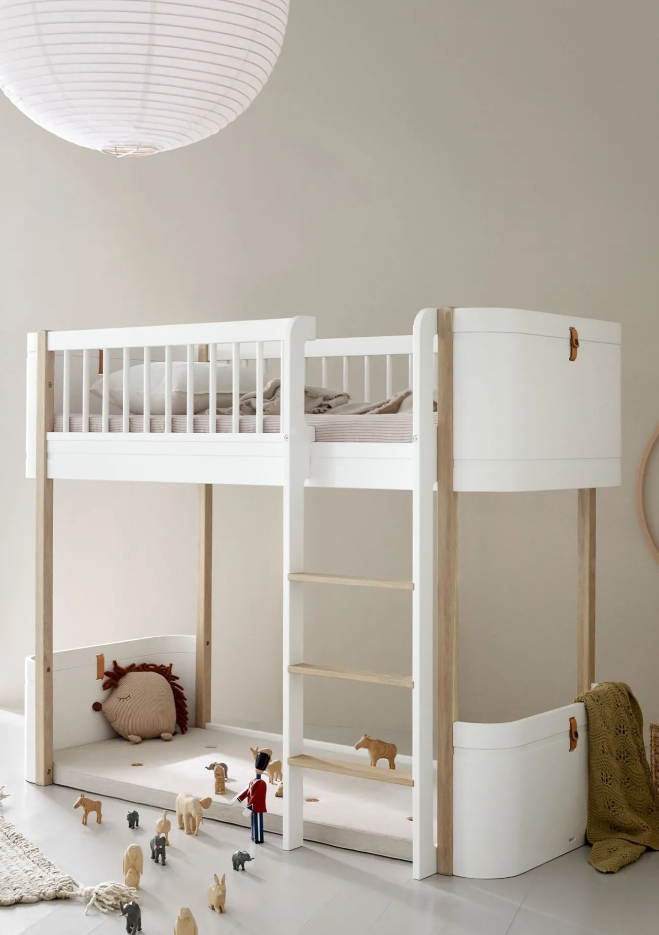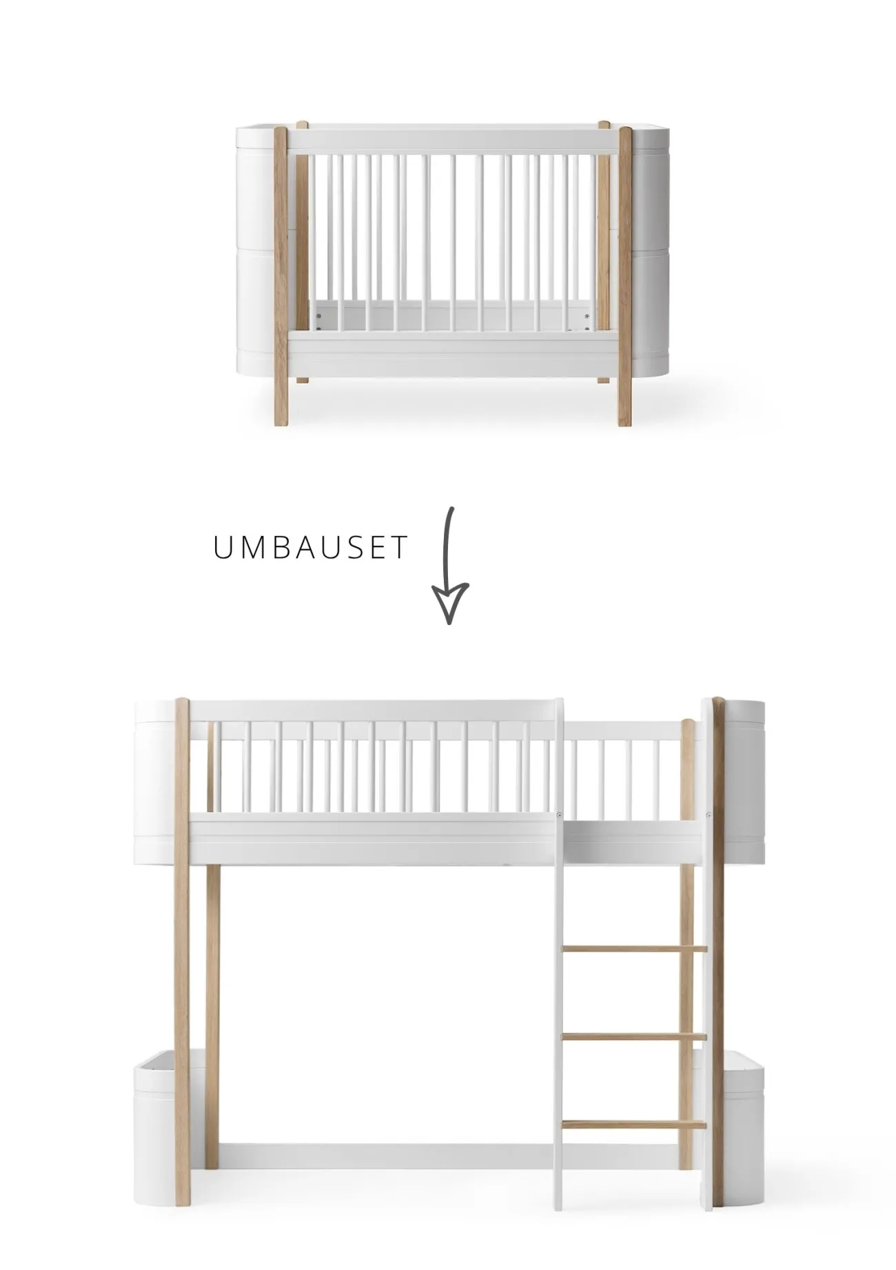 Mit diesem durchdachten Umbauset wird das separat erhältliche Wood Mini+ Babybett (inkl. Juniorbett-Erweiterung) im Handumdrehen zum halbhohen Hochbett. Ideal für Kinder im Vorschulalter entsteht darunter nicht nur praktischer Stauraum, sondern auch ein gemütlicher Rückzugsort zum Spielen, Lesen oder Träumen – eine kleine Höhle mitten im Kinderzimmer.