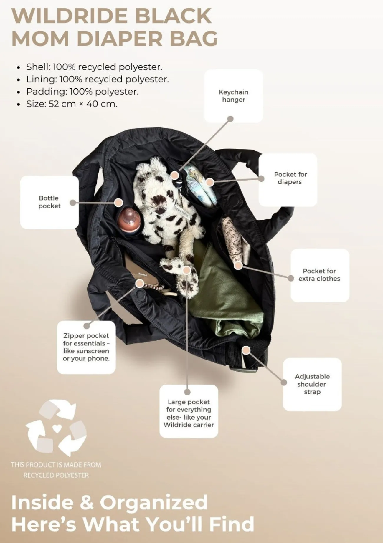 Das robuste Material aus recyceltem Polyester macht die Tasche besonders langlebig und nachhaltig. Der breite, bequeme Schulterriemen sorgt für hohen Tragekomfort – alternativ kannst du die Tasche unkompliziert am Kinderwagengriff befestigen. Mit ihrem eleganten Look setzt du außerdem ein modisches Statement, das auch ohne Kinderwagen überzeugt.