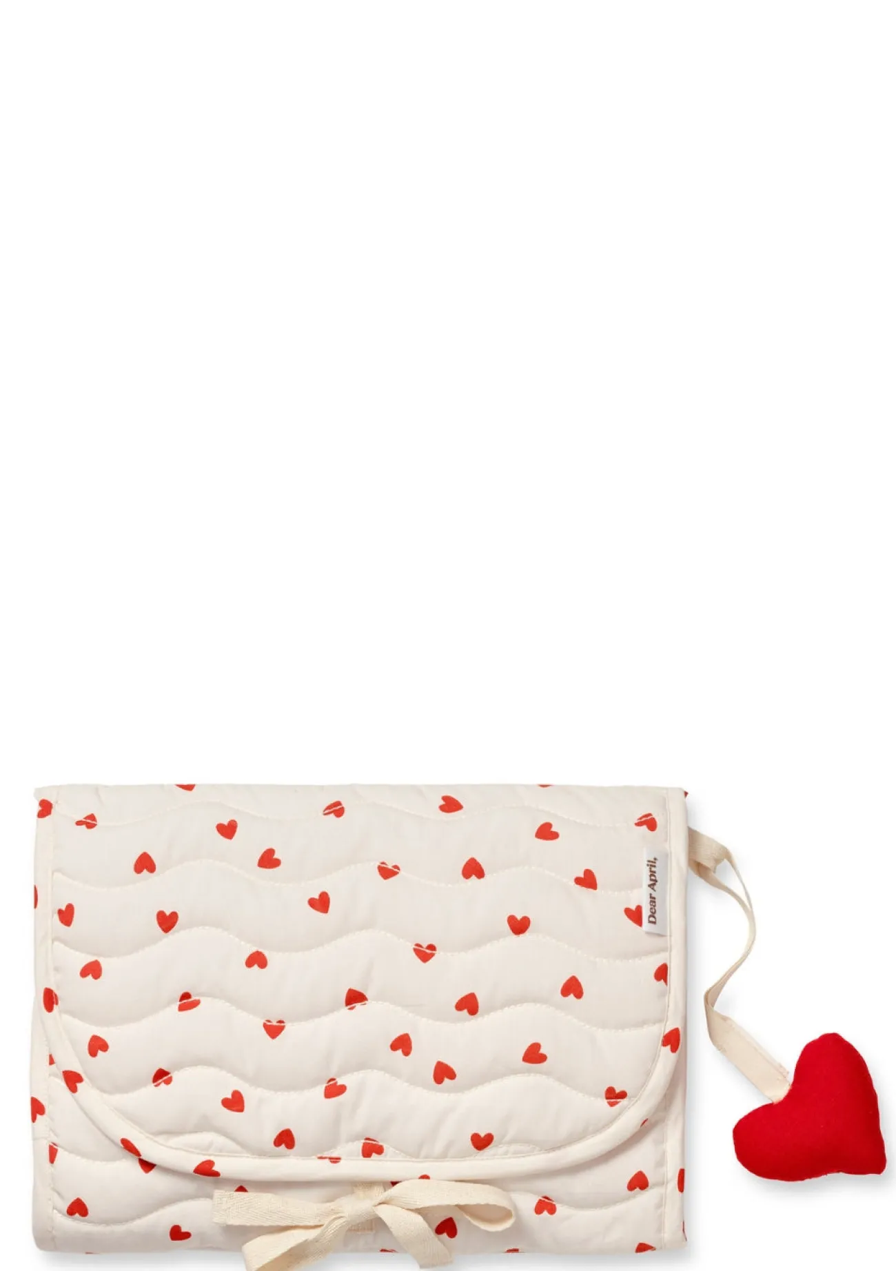 Ein besonders süßes Detail ist das kleine Herzchen, das Babys beim Wickeln beschäftigt und beruhigt. Gefertigt aus wunderbar weicher Bio-Baumwolle und mit dem charakteristischen Wellenmuster von DEAR APRIL gesteppt, bietet River eine angenehm gepolsterte Liegefläche. Die stilvolle Unterlage lässt sich mühelos im Heart Shopper verstauen und ist so jederzeit einsatzbereit.