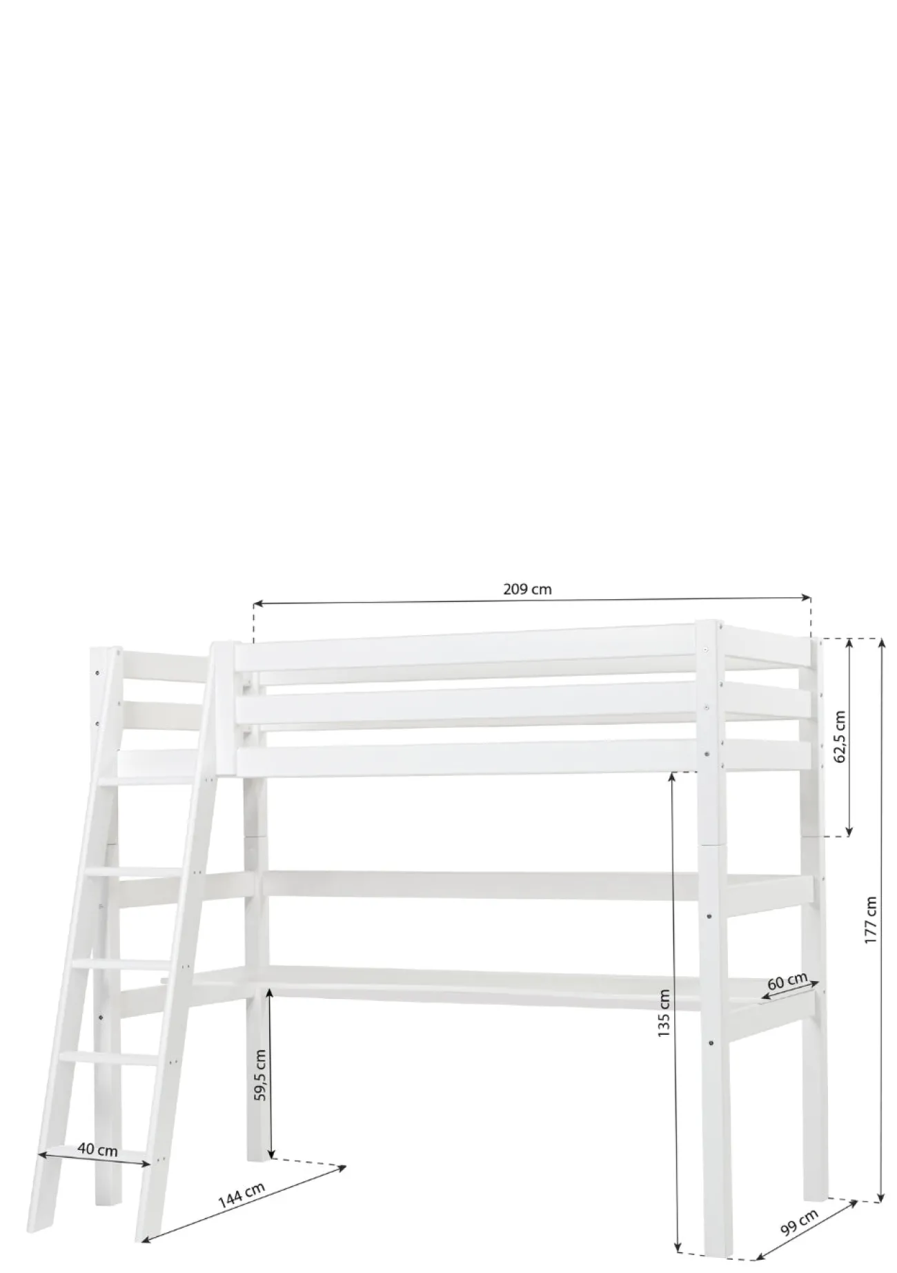 - Bettgröße, schräge Leiter: L 209 x H 177 x T 144 cm