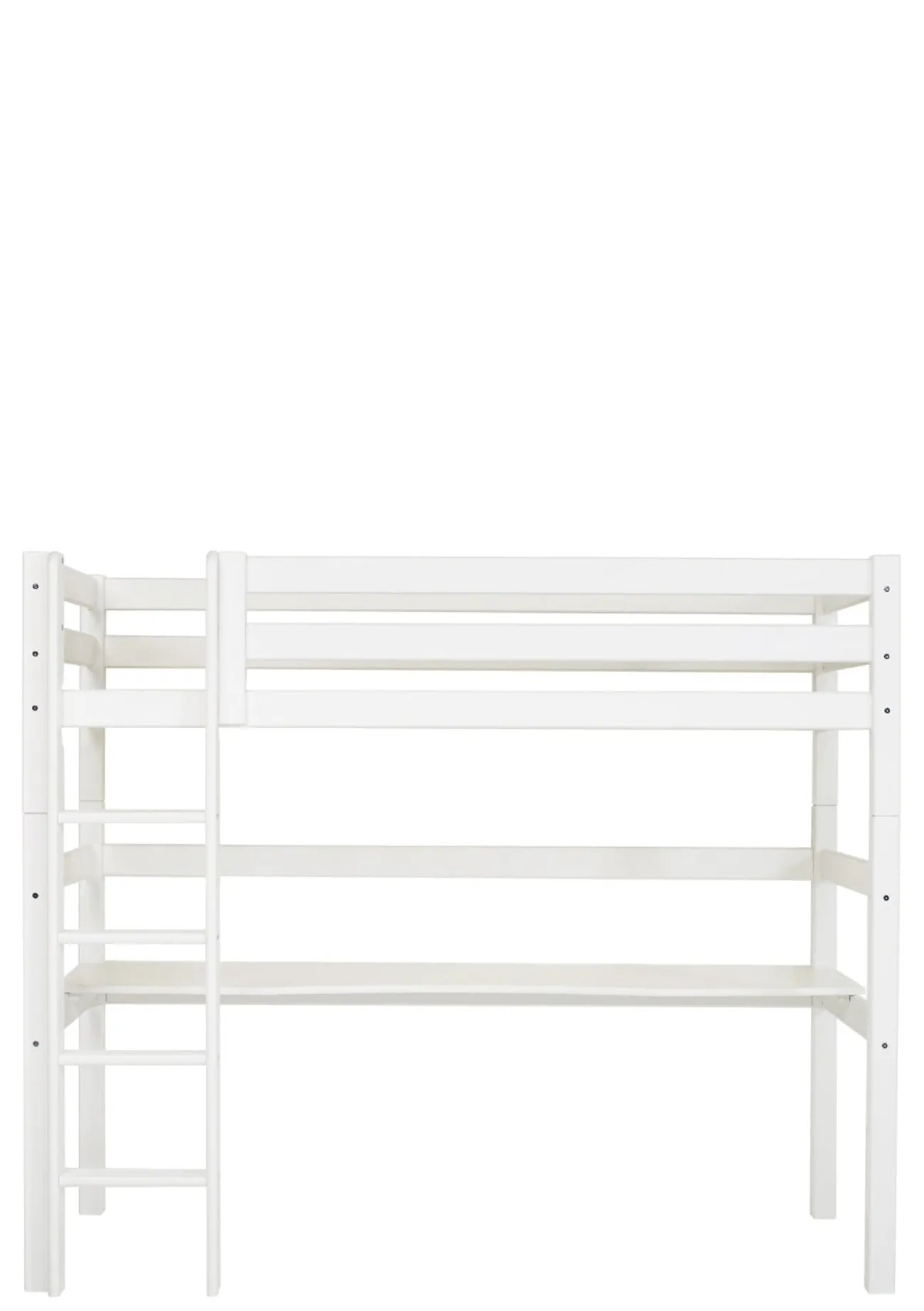 Dieses überaus praktische Hochbett (nach Wahl erhältlich mit einer geraden oder schrägen Leiter) bringt eine großzügige Tischplatte mit und eignet sich ganz hervorragend für Schulkinder. Das Möbelstück vereint Schlaf- und Arbeitsplatz auf raffinierte Weise und macht durch das cleane skandinavische Design auch optisch eine gute Figur in jedem Kinderzimmer. Eine platzsparende Alternative zum herkömmlichen Kinderbett und Schreibtisch! – optimal für kleine Räume.
