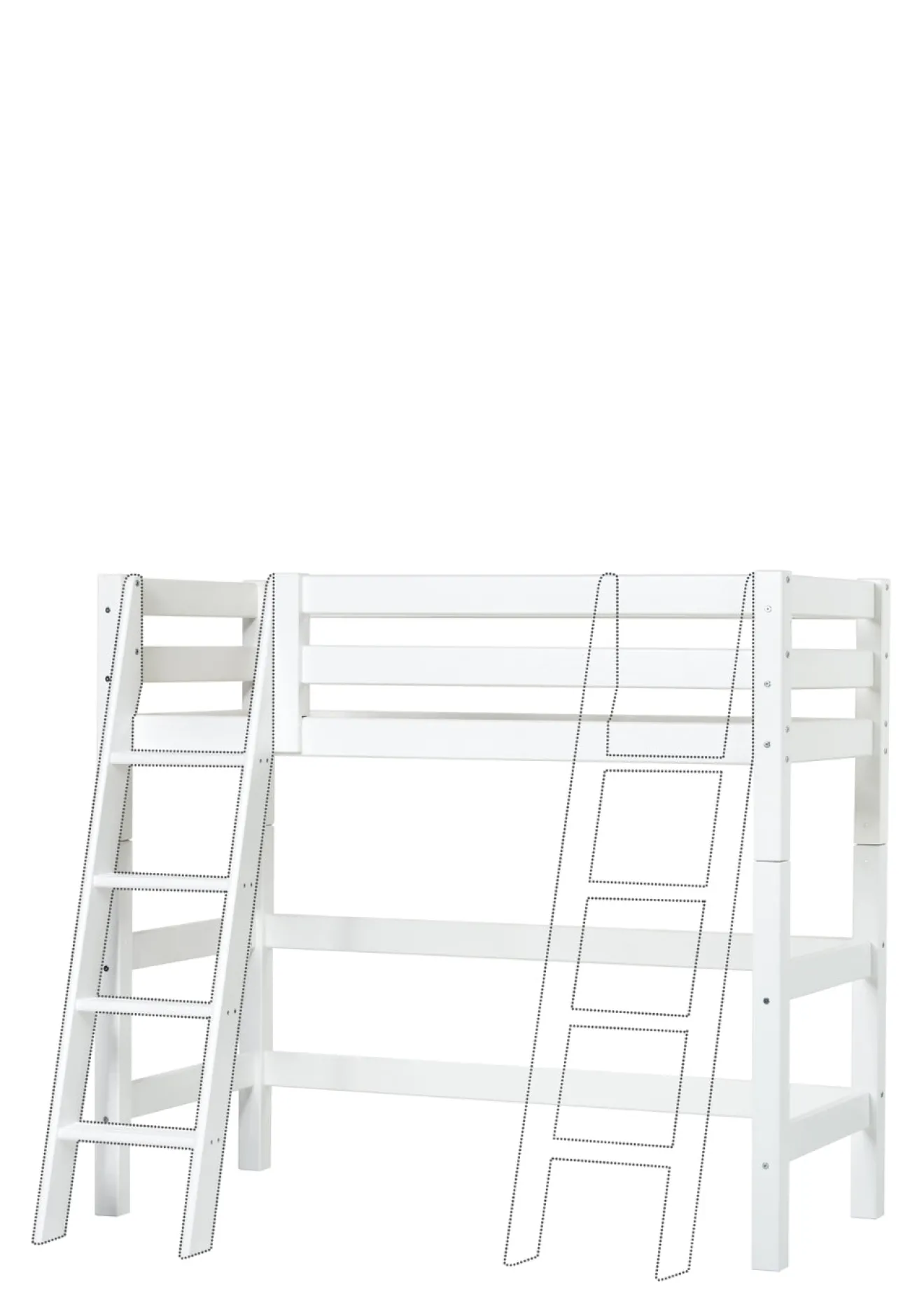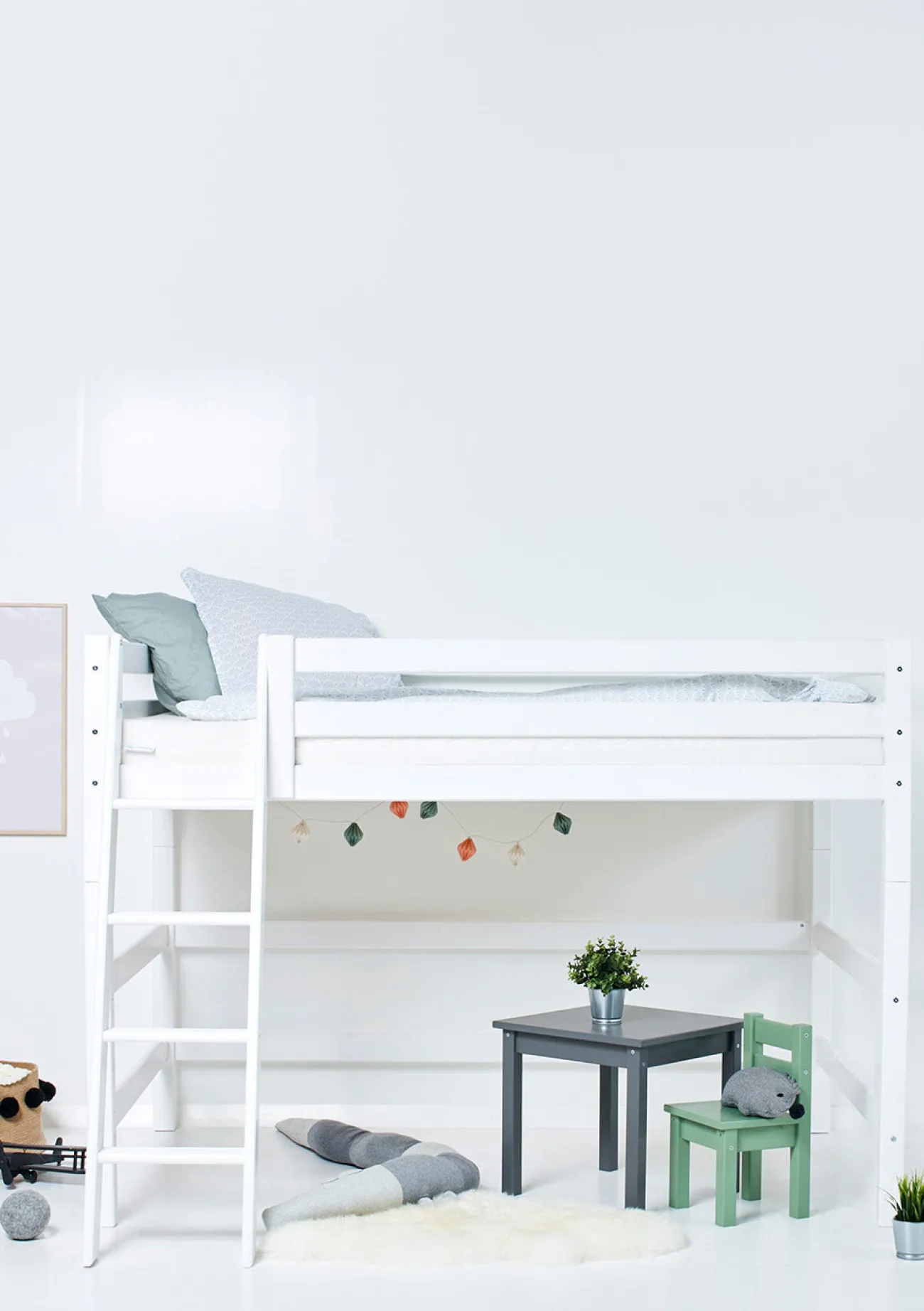 Dieses praktische und clevere Mittelhochbett ist in verschiedenen Größenvarianten erhältlich und kommt nach Belieben mit einer schrägen oder einen geraden Leiter. Mit seiner großzügigen Liegefläche lädt es im oberen Schlafbereich zum Kuscheln und Träumen ein. Die Fläche darunter kann als persönliches Kinderreich herhalten oder zu Aufbewahrungszwecken genutzt werden.