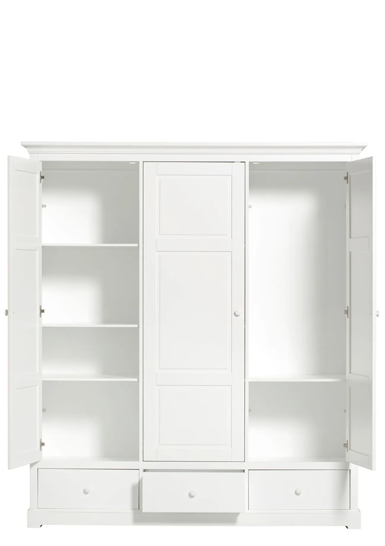 Zeitlos & klassisch schön: der dreitürige Kleiderschrank im nordischen Design aus der Seaside Collection von OLIVER FURNITURE. Der Innenraum kann flexibel mit 12 herausnehmbaren Regalen gestaltet werden. Zudem bieten 3 geräumige Schubladen Platz und auf der durchgehenden Kleiderstange könnt ihr Kleidungsstücke auf der gesamten Breite aufhängen. Durch sein klassisches Design fügt sich der Kleiderschrank leicht in jeden Raum und unterschiedliche Einrichtungen ein.