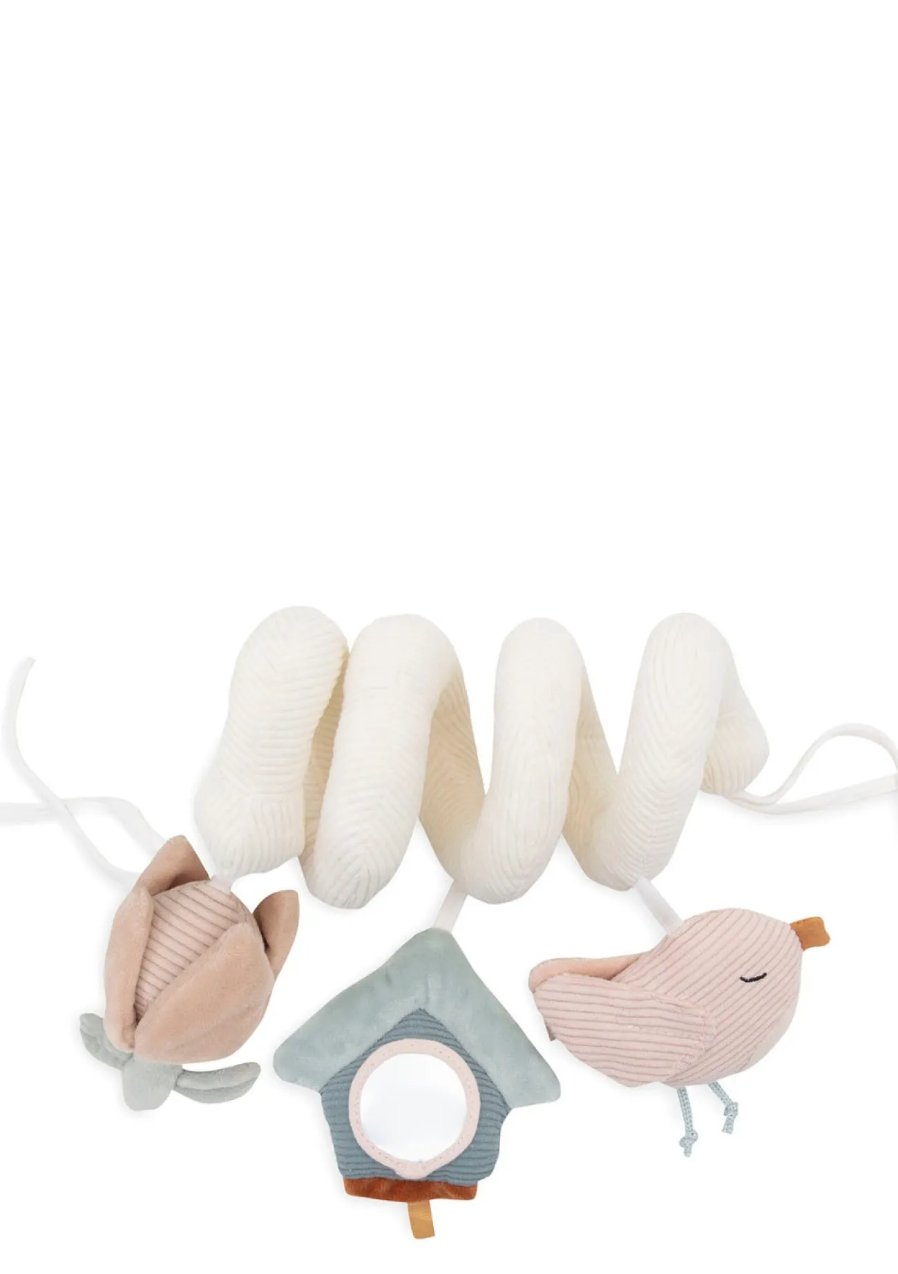 Diese vielseitige Aktivitätsspirale von JOLLEIN sorgt überall für gute Laune und abwechslungsreiche Spiele! Die süße Blume und ein fröhlicher Vogel laden zum Greifen und Tasten ein. Der integrierte Spiegel, ein Glöckchen und ein spannendes Knisterelement fördern spielerisch die Sinne deines Babys. Dank der praktischen Befestigungsschlaufen an beiden Enden lässt sich die Spirale ganz einfach am Laufgitter, Babybett oder an der Babyschale fürs Auto befestigen.