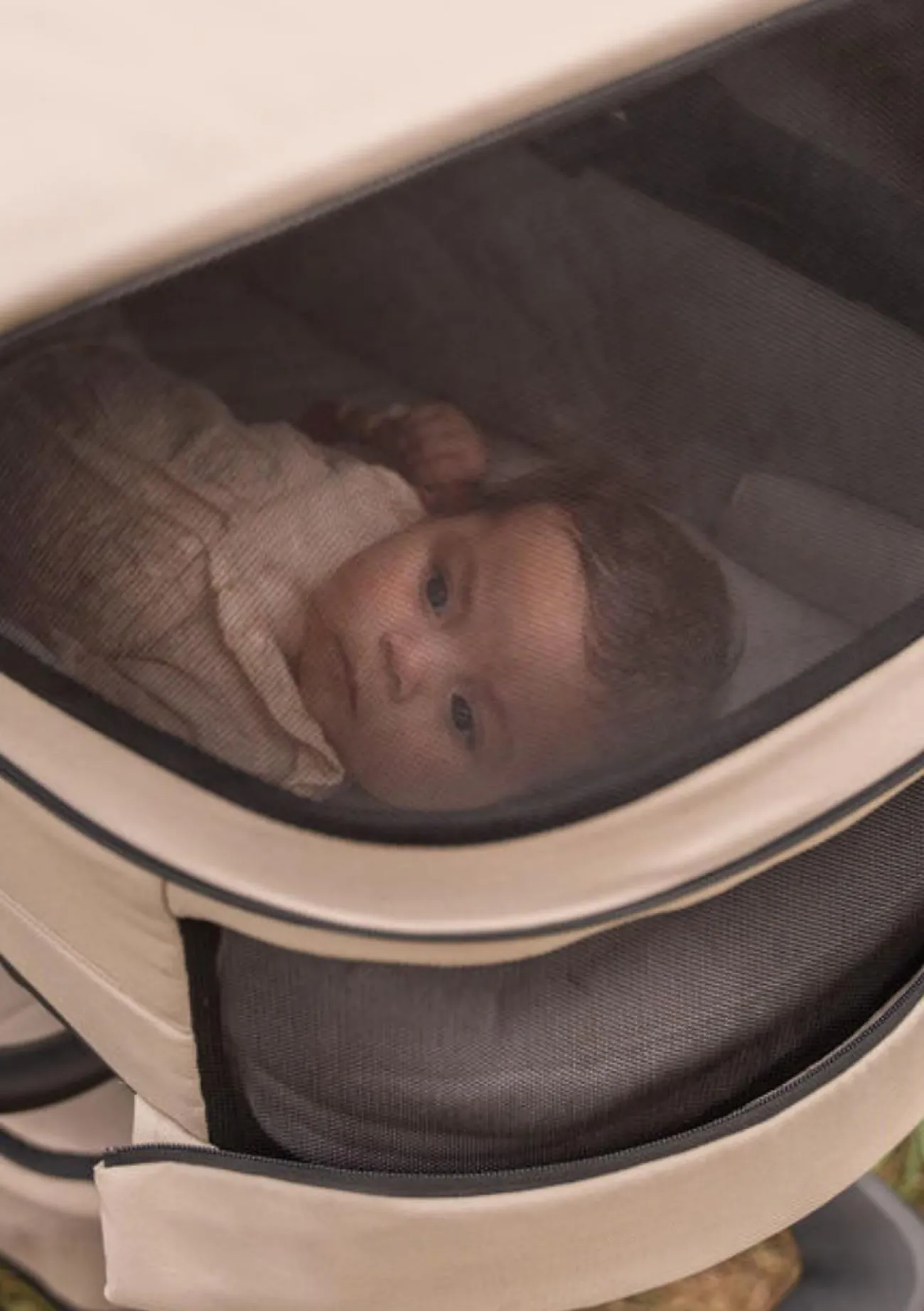 New in: Pearl Taupe. Ein eleganter, beiger Stoff in Kombination mit einem glatten, braunen Spielbügel.