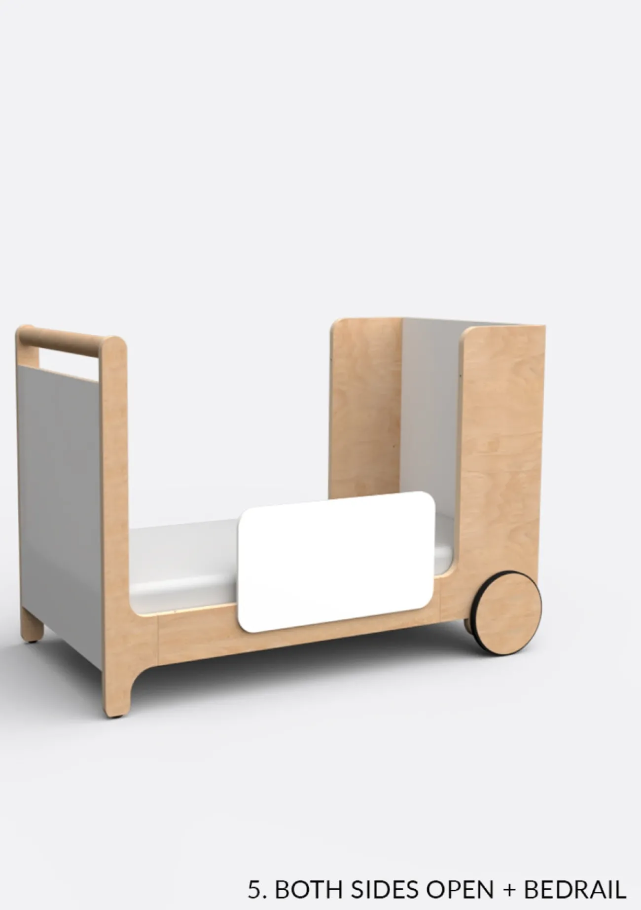 Für noch mehr Komfort und Sicherheit: Optional sind eine passende Matratzenverlängerung sowie ein oder zwei ergänzende Bettgitter erhältlich, welche nach dem Umbau für zusätzlichen Schutz vor dem Herausfallen sorgen – ideal für die Übergangszeit vom Gitter- zum Kinderbett.
