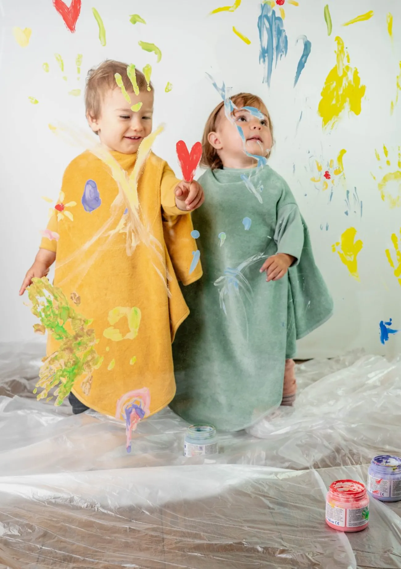 Durchdachte Details wie verstellbare Druckknöpfe im Nacken, weiche Ärmelbündchen und der weite, bequeme Schnitt machen das An- und Ausziehen zum Kinderspiel. Ein echtes Multitalent für kleine Entdecker – egal, ob beim Essen, Malen oder kreativen Ausprobieren.