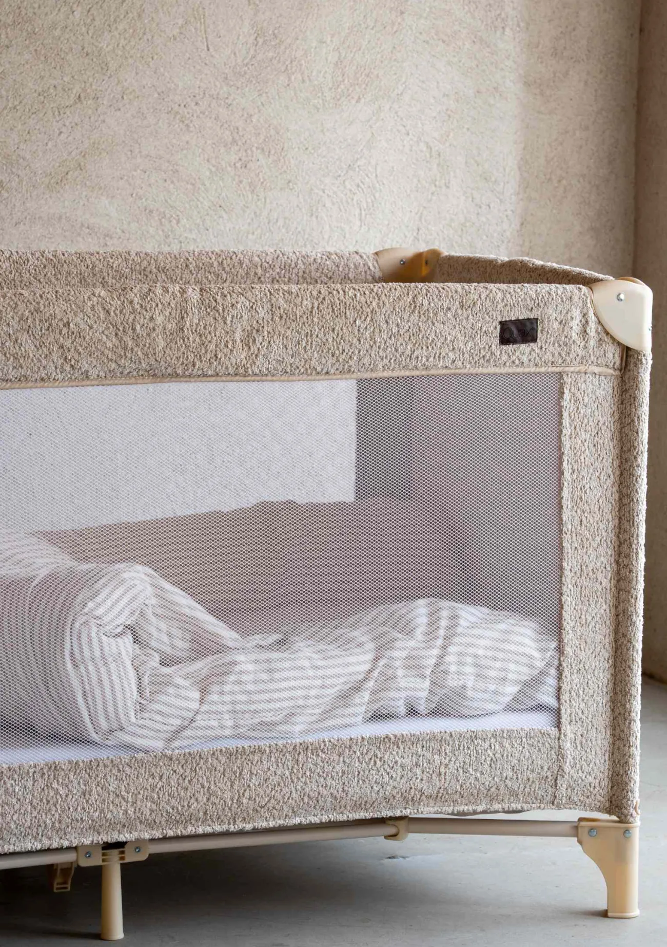 - modernes Reisebett mit weicher Bouclé-Optik
