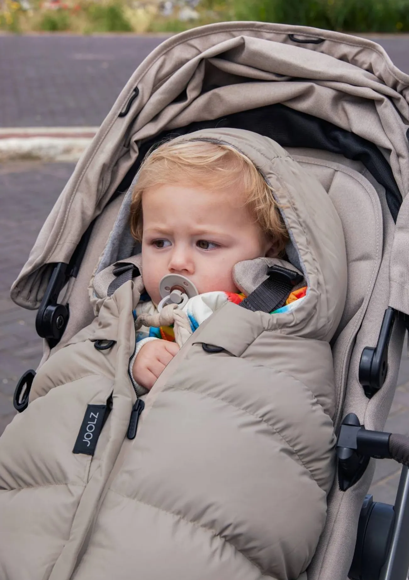 Hält Kälte draußen und Wärme drinnen: der neue Puffer Fußsack von JOOLZ – für mollig warme Winterspaziergänge!