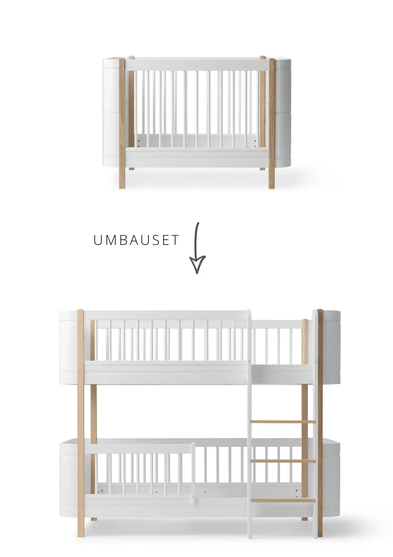 Mit diesem Umbauset wird das separat erhältliche Wood Mini+ Babybett (inkl. Juniorbett-Erweiterung) im Handumdrehen zum halbhohen Etagenbett für Geschwister. Und wieder einmal zeigt sich die Stärke der Mini+ Serie: Sie wächst mit, bleibt stilvoll und passt sich ganz natürlich eurem Familienalltag an.