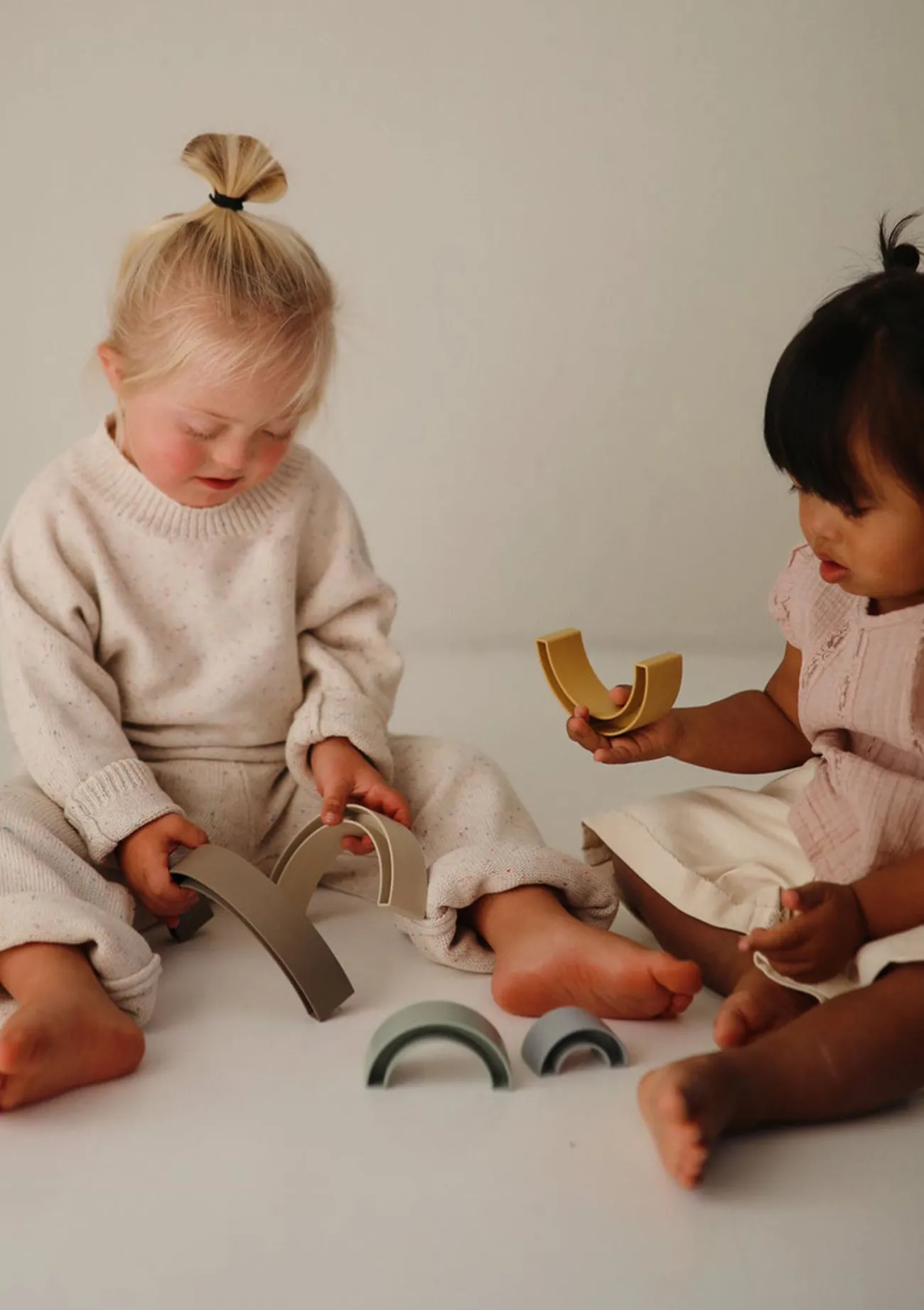 Aus der dänischen Hygge-Kollektion von mushie stammt dieses schöne, verspielte Regenbogen-Set zum Sortieren, Stapeln, Stecken & Spielen. Von der Regenbogenpromenade in Aarhus, Dänemark, inspiriert, ist der Regenbogen auch zeitgleich eine hübsche Dekoration im Kinderzimmer! Kinder können damit Türme, Brücken oder fantasievolle Strukturen bauen und so ihre motorischen Fähigkeiten und ihr logisches Denken entwickeln.