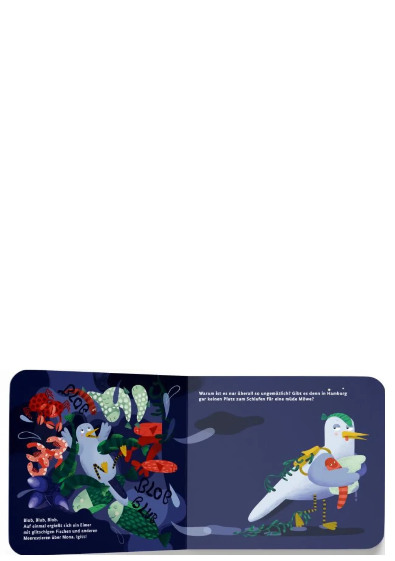 Als es ihr im Winter an der Nordsee zu kalt wird, beschließt die Möwe Mona nach Hamburg zu fliegen, um in der Stadt zu überwintern. Einen ganzen Tag ist sie unterwegs, bis endlich Hamburg in Sicht kommt. Aber dort angekommen, ist es überall viel zu laut, zu hell und zu schmutzig. Wo soll sie nur schlafen? Auf einem Schiff vielleicht? »Ich bin so müde. Wiegst du mich in den Schlaf, liebes Schiff?«, fragt Mona, aber dann schaukelt das Boot viel zu heftig und es wird nichts mit dem verdienten Schlaf. Dann vielleicht besser im Stadtpark? »Ich bin so müde. Zählst du mit mir die Sterne am Himmel, liebes Planetarium?«, fragt die Möwe, aber dann entpuppt sich der Sternenhimmel als viel zu lautes Feuerwerk. Und so muss Mona auf dem Fischmarkt, dem Dom und im Hafen noch einige weitere Versuche unternehmen, bis sie am Elbstrand endlich in einen traumschweren Schlaf fällt. Dieses Einschlafbuch von Hamburg-ABC-Zeichnerin Karin Lindeskov schickt kleine Zu-Bett-Geherinnen mit seinen magisch-realistischen Bildern der nächtlichen Stadt zuverlässig ins Land der Träume und wird durch seine vielen charmanten Illustrationsdetails auch Vorleserinnen und Vorlesern so schnell nicht langweilig.
