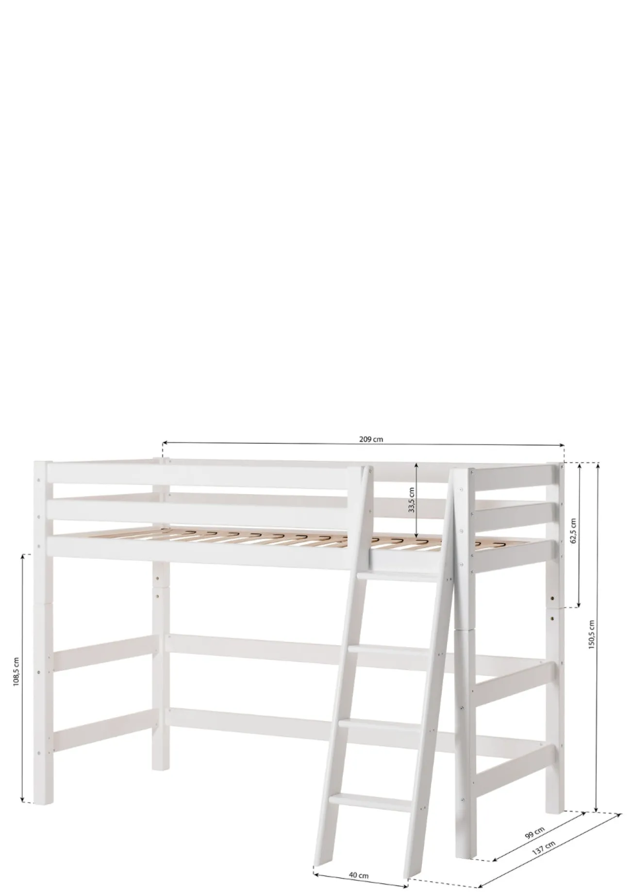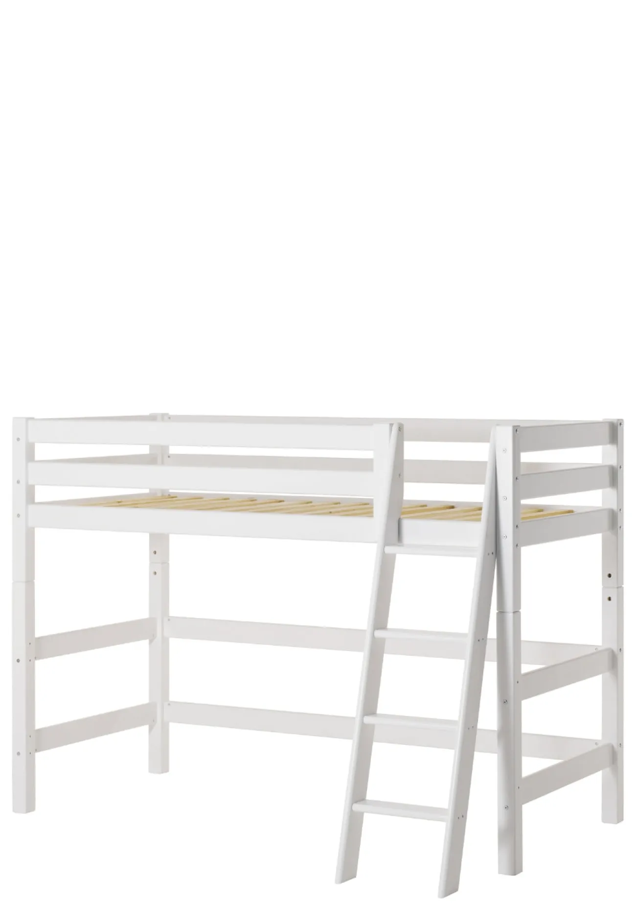 Dieses praktische und clevere Mittelhochbett ist in verschiedenen Größenvarianten erhältlich und kommt nach Belieben mit einer schrägen oder einen geraden Leiter. Als platzsparende Alternative zum herkömmlichen Kinderbett ist das Modell auch für kleine Räume prima geeignet, da es unterm Schlafbereich ausreichend Platz bietet. Diesen könnt ihr nach Bedarf zu Aufbewahrungszwecken oder zum Schaffen eines eigenen kleinen Kinderreichs nutzen.