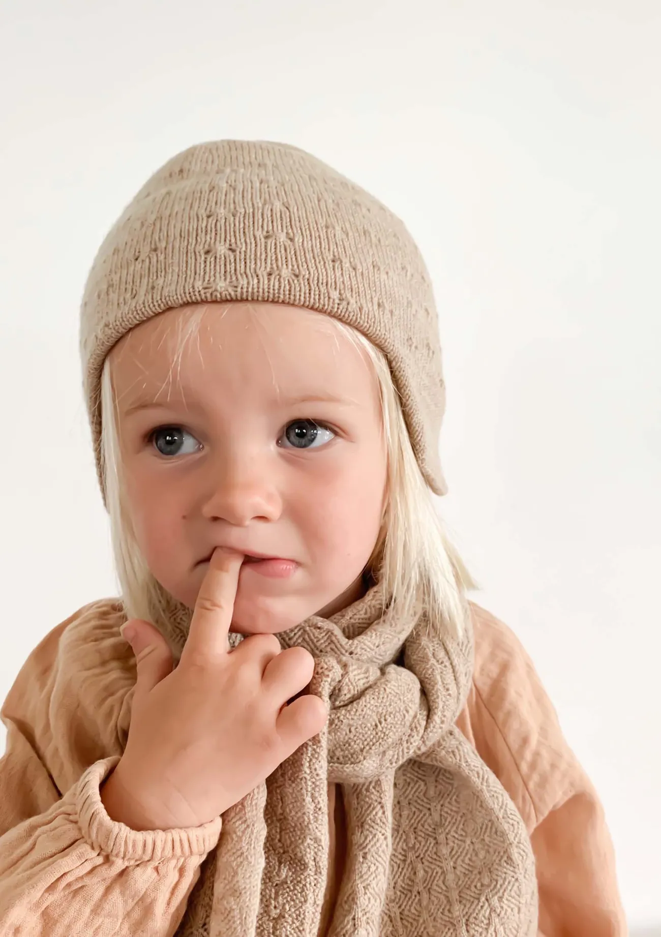 Der Winter kann kommen: Mit der süßen Strickmütze aus reiner Merino-Wolle ist dein Kind geschützt vor eisigem Wind und Wetter! Die Mütze hält garantiert mollig warm, ist atmungsaktiv und besonders süß dank der kleinen Strickstruktur und den Ohrenklappen.