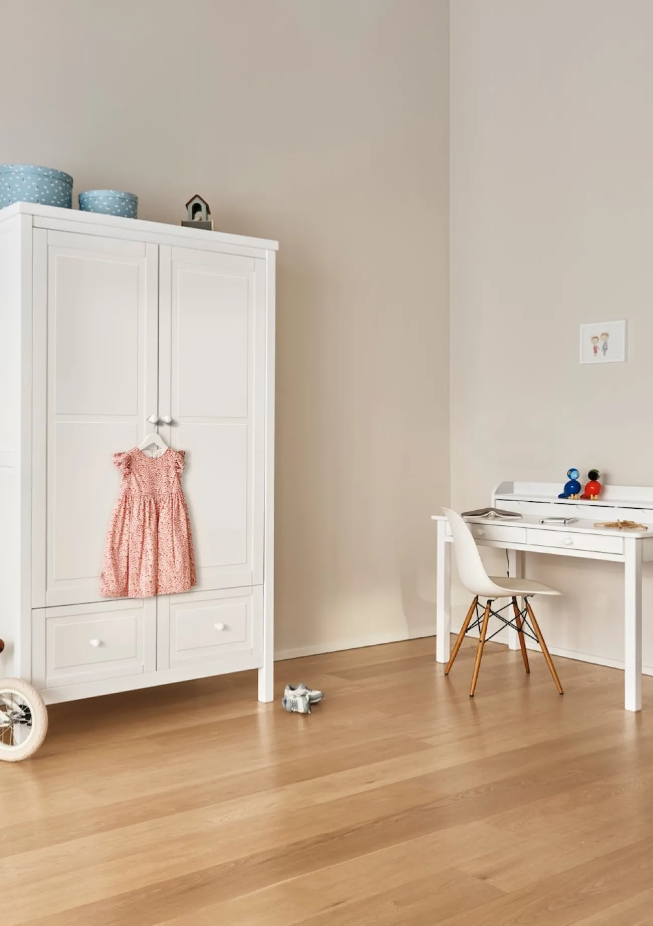 Ob Hausaufgaben machen, malen oder basteln – dieser Kinderschreibtisch schafft die optimale Umgebung zum Lernen und kreativ sein. Mit seiner großzügigen Arbeitsplatte und zwei geräumigen Schubladen bietet er ausreichend Platz für Schulhefte, Papier, Stifte und Co. Wer noch mehr Stauraum benötigt, profitiert vom optional erhältlichen Schreibtischaufsatz mit weiteren Fächern. Wie alle Produkte der Marke zeichnet sich der der Tisch aus zertifiziertem Massiv durch seine hochwertige Qualität aus und lässt sich durch den cleanen Look spielend in jedes Kinderzimmer einfügen und harmonisch mit diversen Möbel kombinieren. Das Modell ist stabil und robust und verfügt über abgerundete Ecken für höchstmögliche Sicherheit im Reich der Kleinen. Die großzügige Arbeitsfläche ist glatt geschliffen und pflegeleicht. Je nach Körpergröße deines Kindes steht der Tisch in zwei verschiedenen Höhen zur Auswahl und kann nach Belieben mit einer Handbemalung individualisiert werden – für einen einzigartigen Charakter!