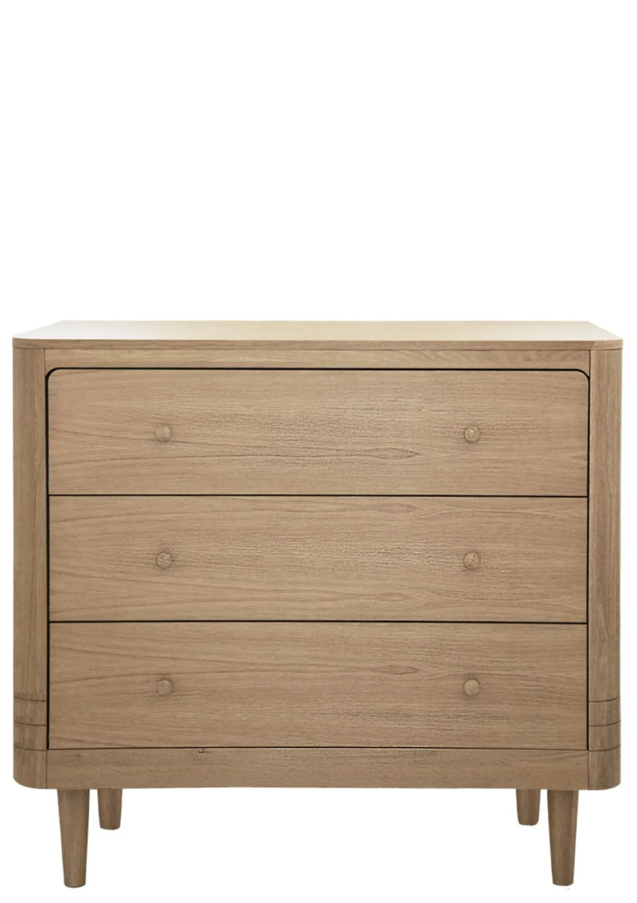 Die drei großzügigen Schubladen bieten Platz für Kleidung, Textilien oder Alltagsutensilien. Schlichte runde Holzknäufe betonen das puristische Erscheinungsbild und sorgen für eine angenehme Haptik im täglichen Gebrauch.