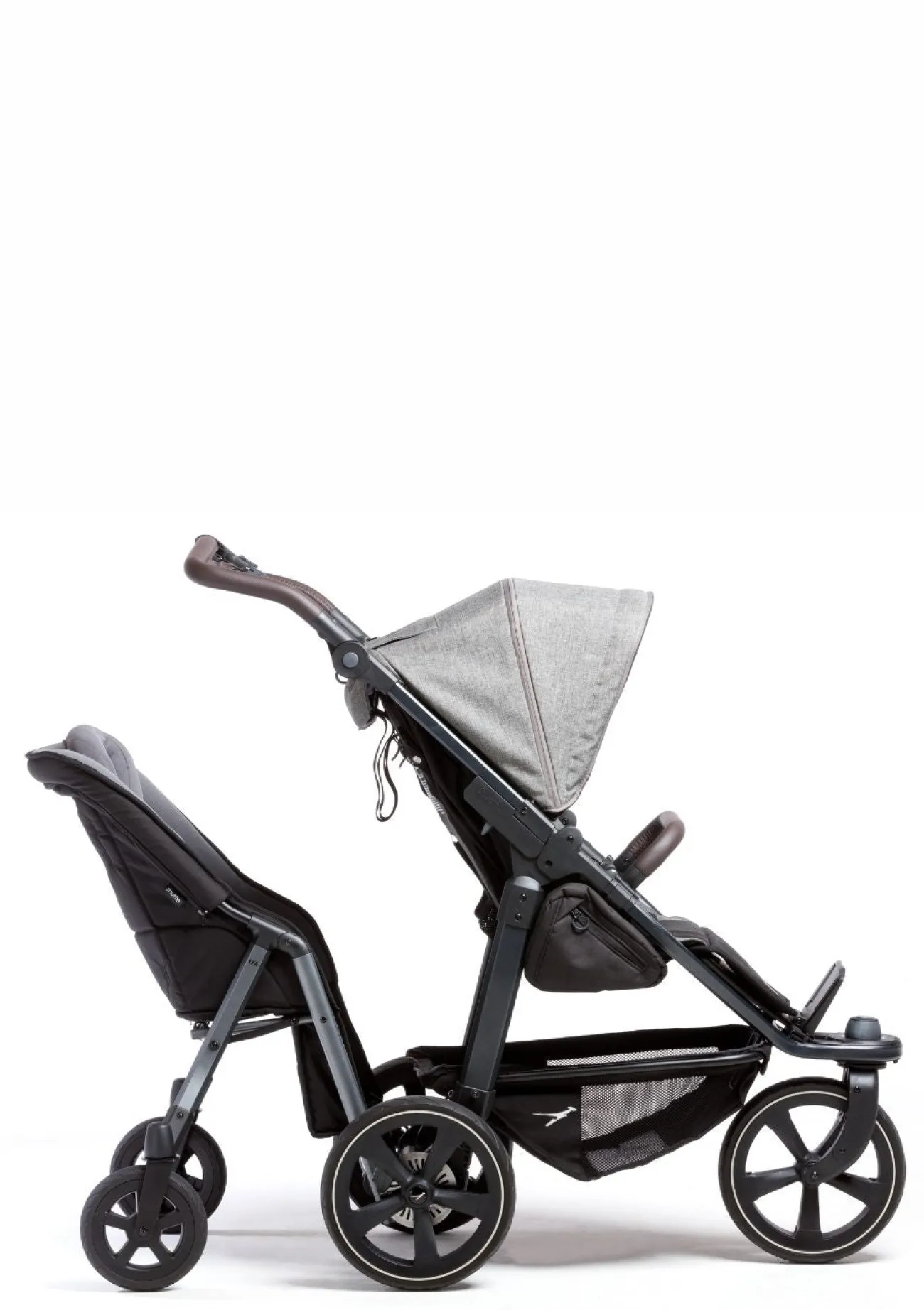 Bequemer geht es kaum: In diesem innovativem Zweitsitz kann das ältere Geschwisterchen Platz nehmen und mitfahren. Auf diese Weise ermöglicht der TFK ‚Shuttle‘ den angenehmen Transport von zwei kleinen Kindern ohne Geschwisterwagen. Durch die hohe Rückenlehne und das weiche Kopfpolster erlebt auch das ältere Kind höchsten Fahrkomfort. Der weite Radstand stellt ein angenehmes Schieben sicher.