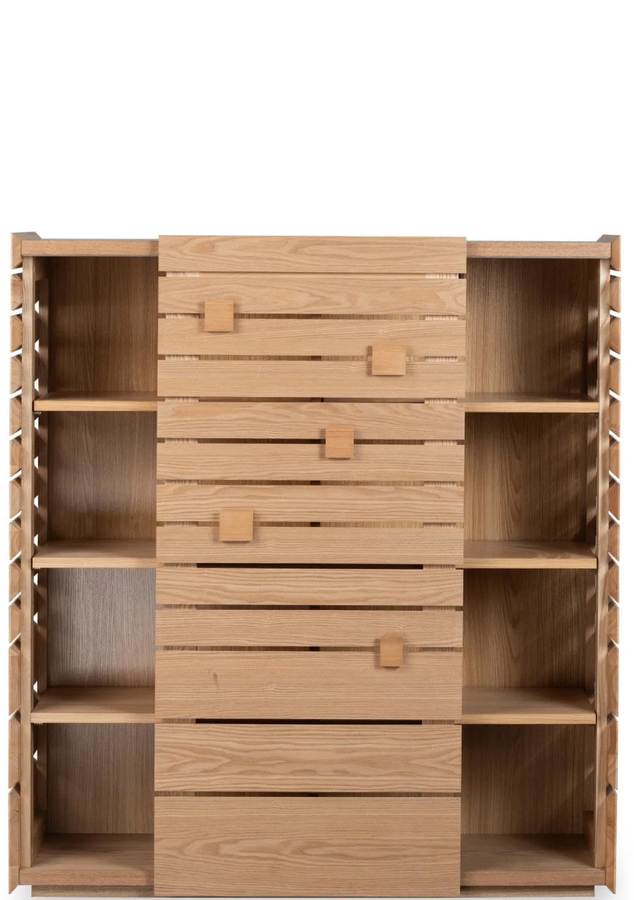 Ein besonderes Designdetail sind die beweglichen Holzblöcke an der Außenseite, ein verspieltes Element, das Kinder zum Entdecken anregt und dem Möbelstück einen individuellen Charakter verleiht. Für maximale Flexibilität kann der Aufbewahrungsschrank frei stehend oder wandmontiert verwendet werden – ganz nach Raum und Stil. Mit seiner klaren Formensprache und der natürlichen Eschenoptik wird er zum Hingucker in jedem Raum.