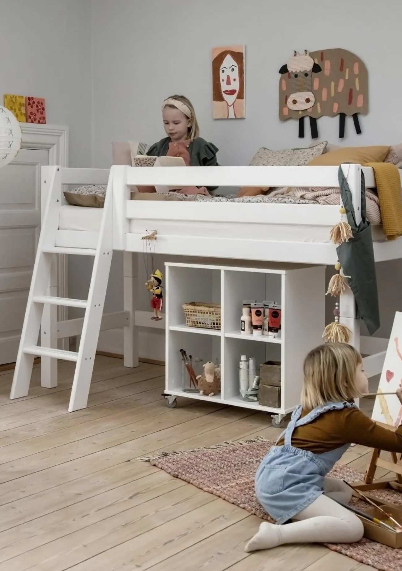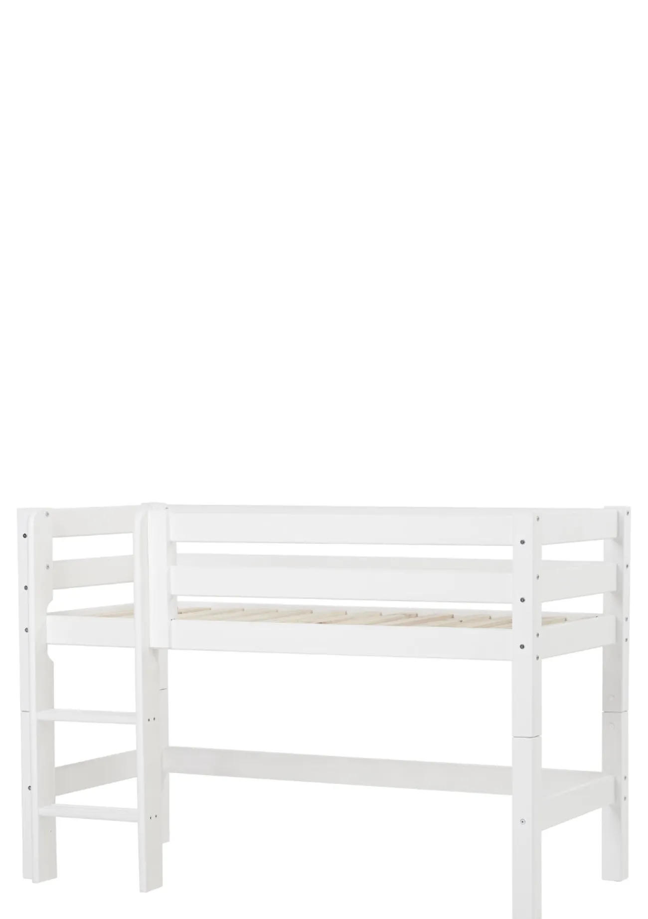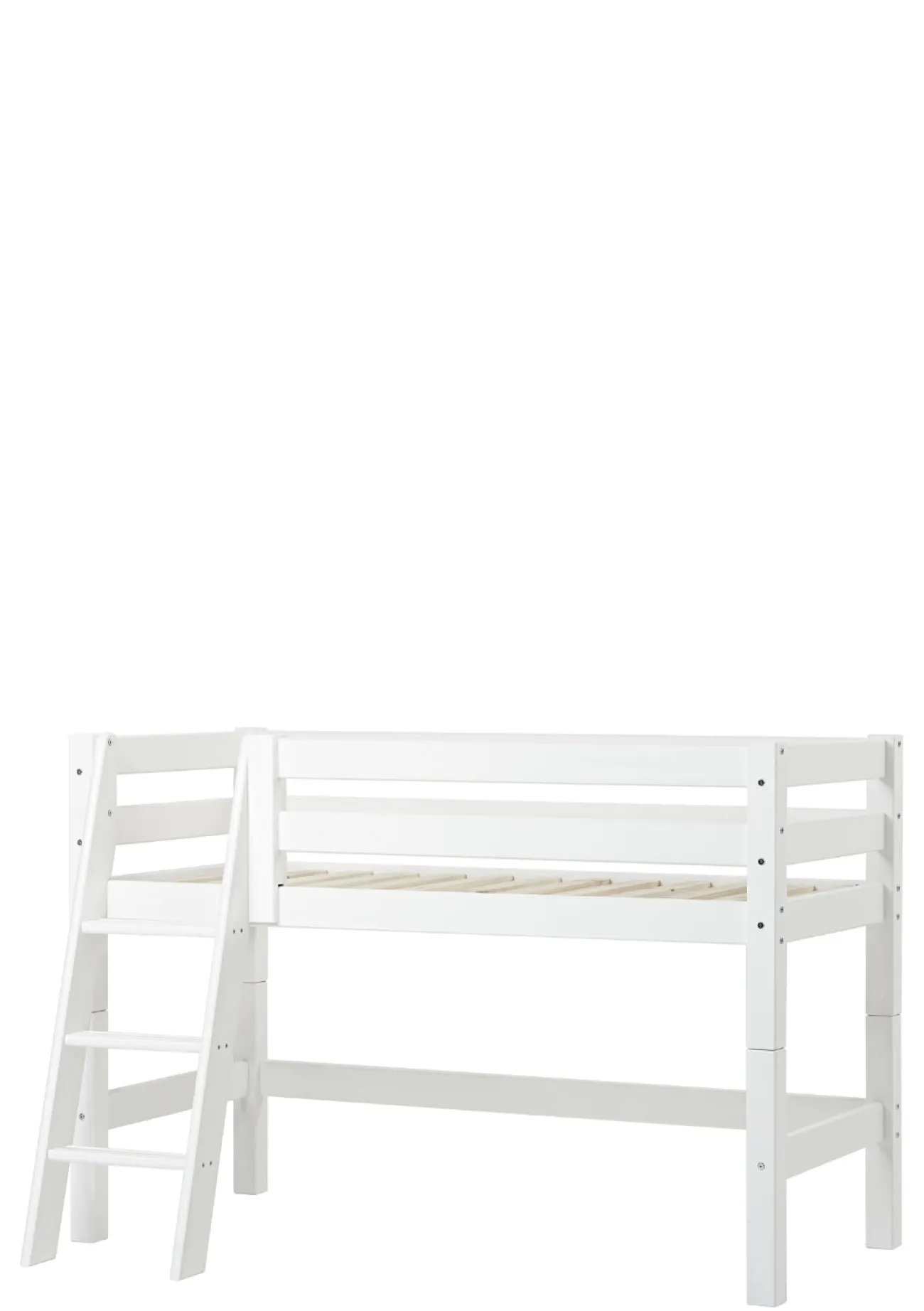 Dieses moderne Halbhochbett ist in verschiedenen Größenvarianten erhältlich und kommt nach Belieben mit einer schrägen oder einen geraden Leiter. Die Höhe des Bettes ist prima für kleinere Kinder geeignet. Denn es nicht so hoch, dass sich diese unsicher fühlen könnten. Den Platz unter dem Bett kannst dafür nutzen, deinem Liebling eine gemütliche Kuschelhöhle zum Verstecken, Spielen oder Vorlesen zu schaffen, oder zu Aufbewahrungszwecken verwenden.