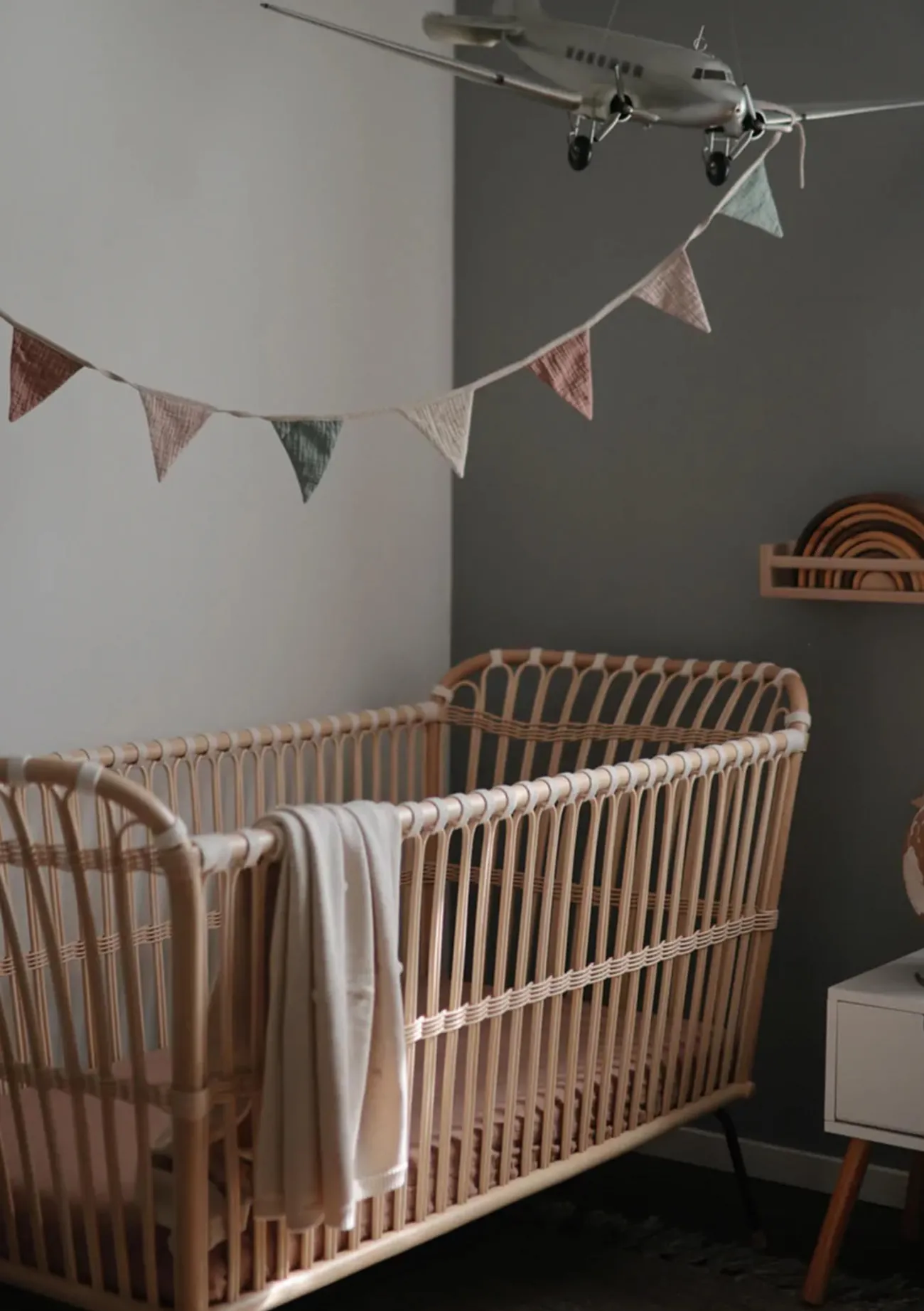 Wunderschöne Deko für den Wickeltisch: die bunte Girlande des amerikanischen Labels MUSHIE! Denn Babys lieben alles, was bunt ist und sich bewegt. Mit den zarten, neutralen Farben ist die Girlande auch für Eltern schön anzusehen. Und nicht nur über dem Wickeltisch, auch über dem Bett, am Schrank oder an der Wand macht sich die Wimpelkette wunderbar als stilvolle Kinderzimmer-Deko.