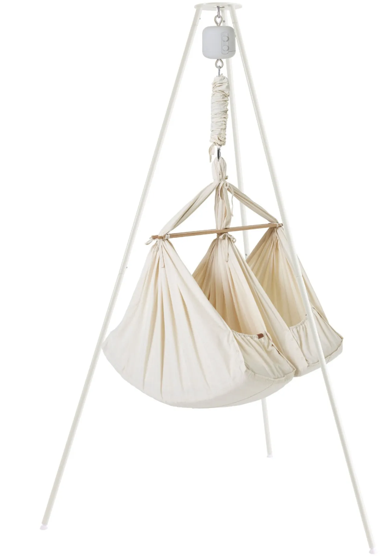 - umfassendes Set bestehend aus Zwillings-Federwiege mit zwei Schlafplätzen, Ständer und geräuscharmem Federwiegenmotor LeeLo01