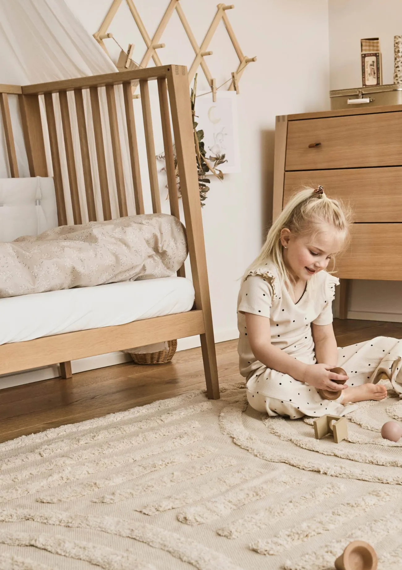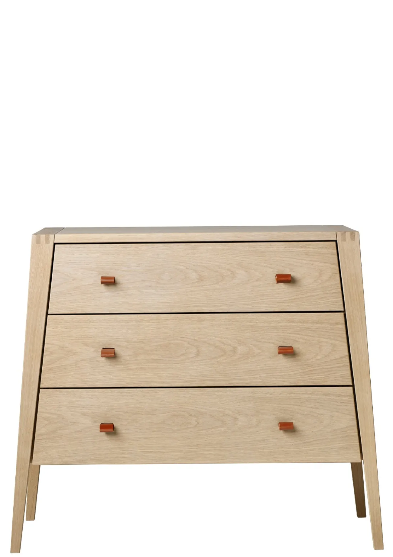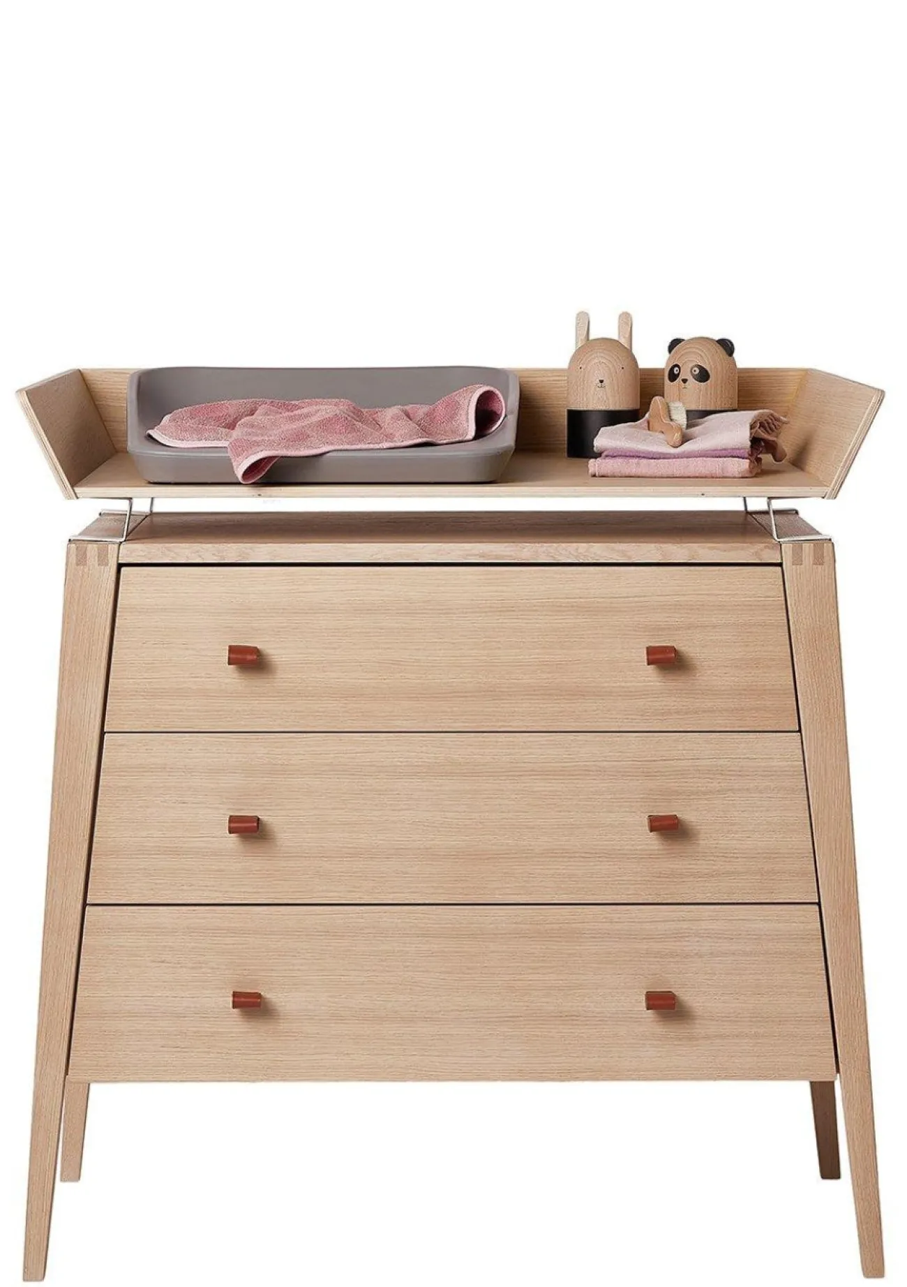 Drei geräumige Schubladen mit Soft-Close-Funktion bieten reichlich Platz für Kleidung, Spielsachen und andere Utensilien. Dank der weichen Ledergriffe in kindgerechter Höhe können selbst die Kleinsten die Schubladen leicht öffnen und schließen – perfekt, um die Selbstständigkeit zu fördern. Die durchdachte Höhe macht die Kommode außerdem ideal, um sie mit dem optional erhältlichen Wickelaufsatz zu kombinieren und als Wickelplatz zu nutzen.