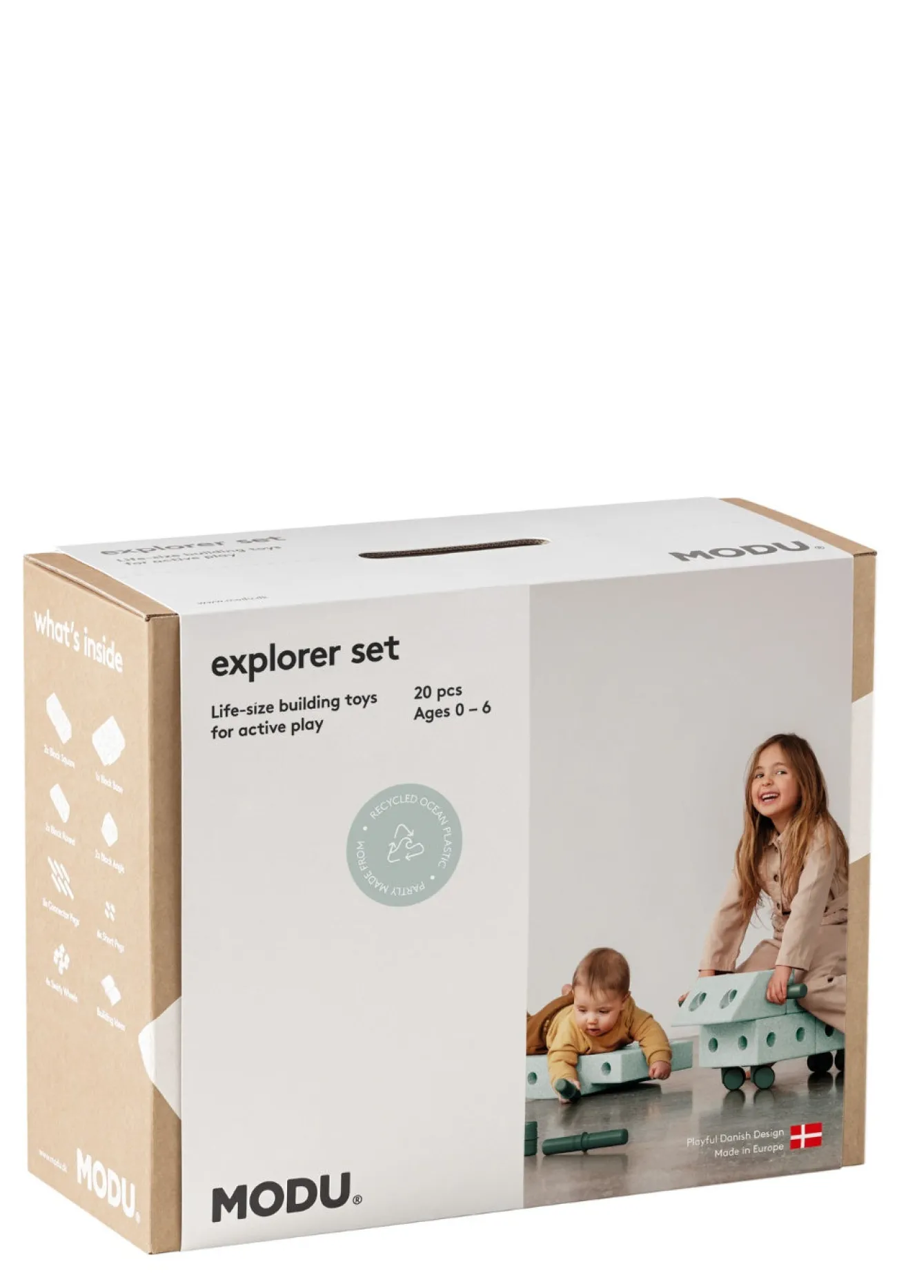 Insgesamt 20 Elemente, darunter Schaumstoffbausteine, Verbindungsstifte und Drehrollen zum Aufeinanderstecken und Spielen, beinhaltet dieses umfassende Explorer-Set. Es ermöglicht dir und deinem Kind den einfachen Einstieg in das Modu-Spielsystem, eignet sich aber auch als Erweiterung zu bereits vorhandenen Bauteilen. Schnelle Rutschautos, die kleine Flitzer auf ihre Kosten bringen, sind schnell gebaut, genau wie verschiedene Balance-Figuren, mit denen die Kleinen ihr Gleichgewicht trainieren. Entdeckt mit dem im Lieferumfang enthaltenen Booklet 20 aufregende Aufbau-Möglichkeiten oder entwickelt eure eigenen aufregenden Kreationen – der Fantasie sind keine Grenzen gesetzt! Übrigens: Die lebensgroßen Bausteine, die zur Reinigung sogar in den Geschirrspüler dürfen, sind nicht nur unheimlich kreativitätsfördernd, sondern auch umweltfreundlich. Sie werden nämlich ganz nachhaltig, zum Teil aus recycelten Plastikabfällen aus dem Meer hergestellt. Finden wir klasse!